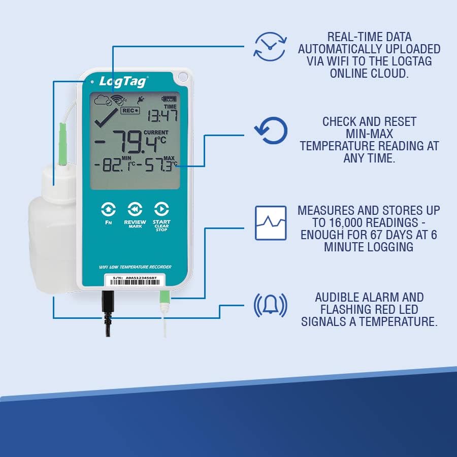 The LogTag UTREL30-WiFi single probe low-temperature recorder kit comes complete with the UTREL30-WiFi data logger, an ST10 probe and a temperature buffer, including a NIST traceable calibration. The logger automatically uploads real-time temperature data from its connected external probe to your LogTag Online cloud account via your existing wireless network. It can also store up to 16,000 real-time temperature readings, features a large easy-to-read display and is designed to show ‘at a glance' if temperature excursions have occurred during the current day and up to the previous 29 days. If temperature readings are outside pre-set alarm limits, it is indicated by a large X on the display and a blinking red alert LED. Alerts will be sent from LogTag Online to registered users. A built-in buzzer will optionally sound an audible alarm. A second probe is optionally available.