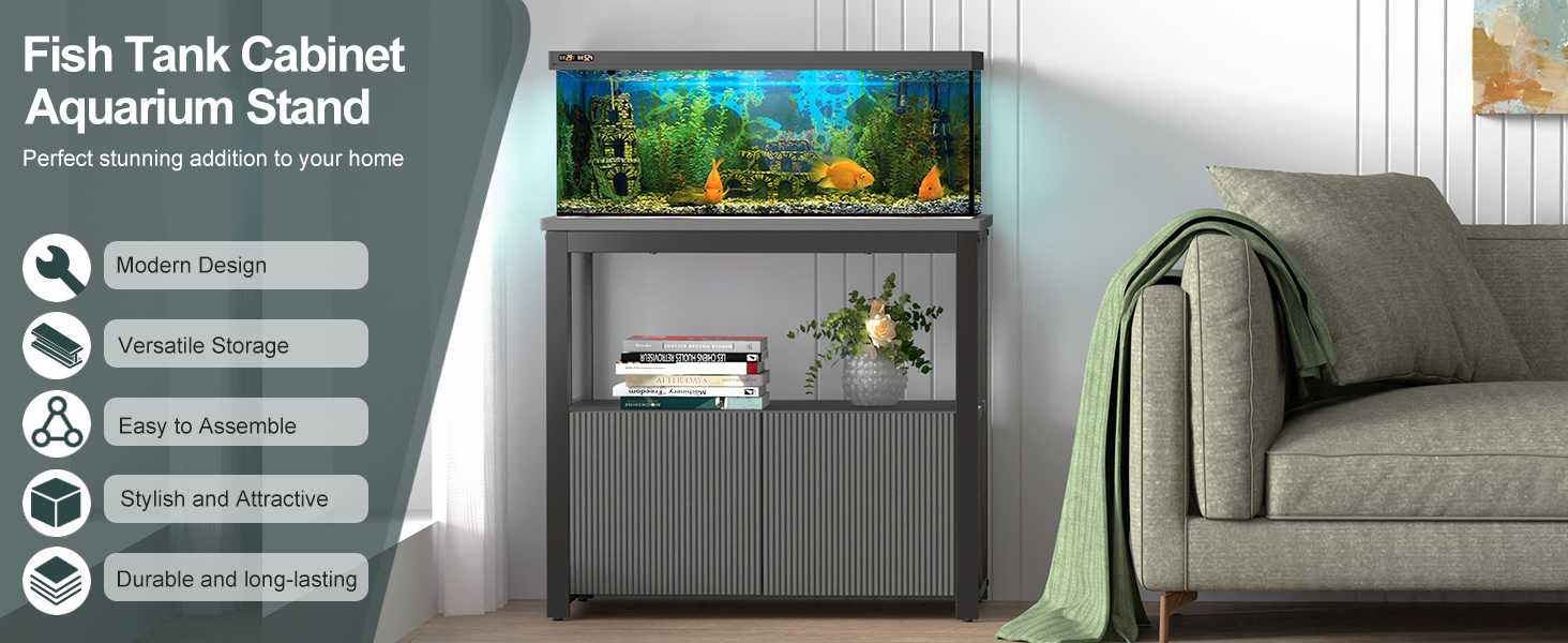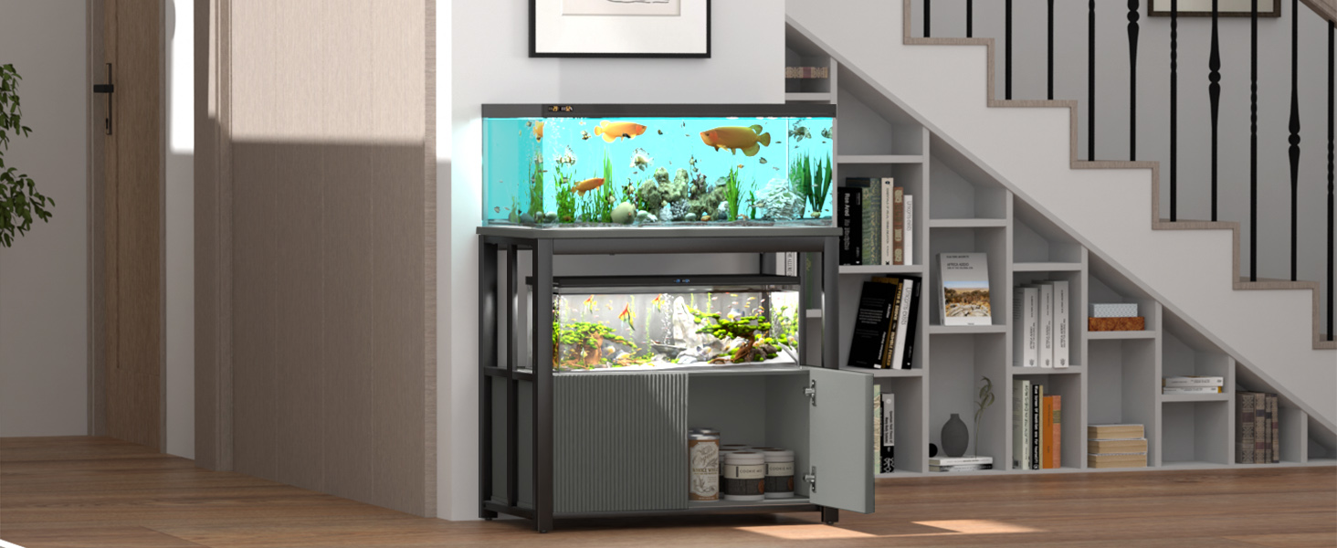 متعدد الوظائف للتخزين: بالإضافة إلى وضع خزان الأسماك بمستويين، يتميز هذا الحامل أيضًا بخزانة لتخزين طعام الأسماك والشباك ومنظف الحصى ومكيف المياه وغيرها من الملحقات. وهذا يضمن بيئة مرتبة ومنظمة حول حامل حوض السمك الخاص بك