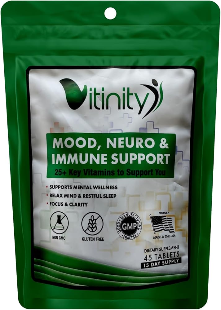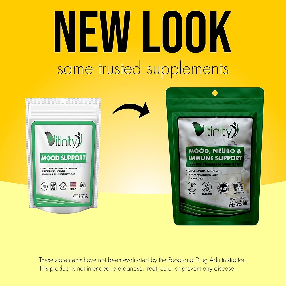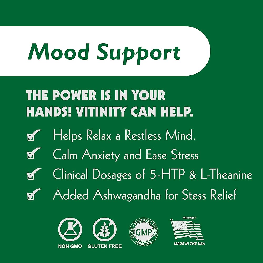 Vitinity Mood Support is a Natural Supplement formulated to help with your day to day worries. It's herbal ingredients support a good Mood, our mood support supplement was formulated by a Doctor - a Ph.D who picked the most effective ingredients needed to replenish the body with nutrients, support mood function, loaded with amino acids, vitamins, minerals along with botanicals.