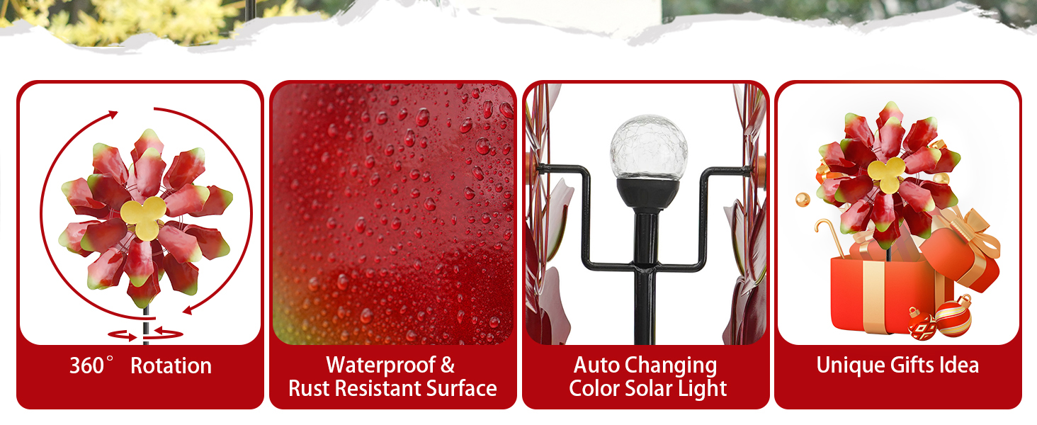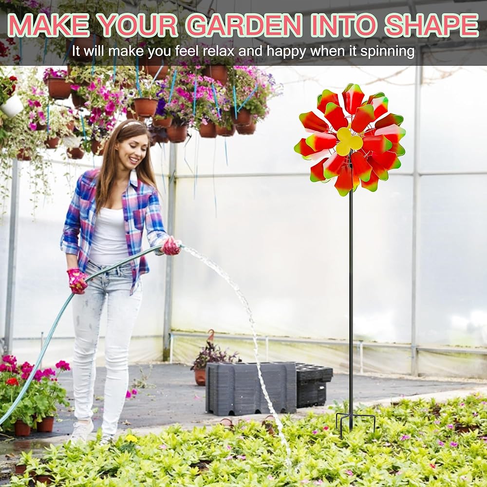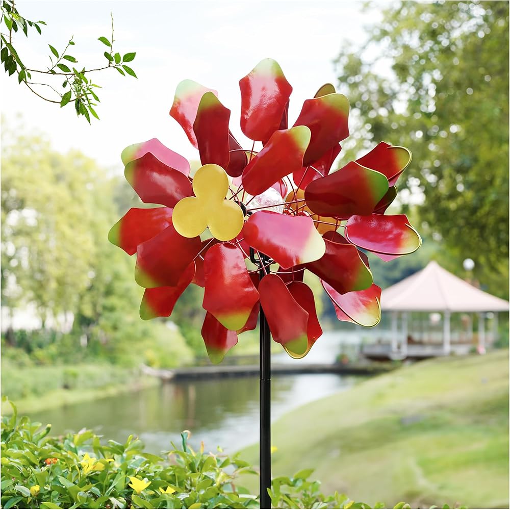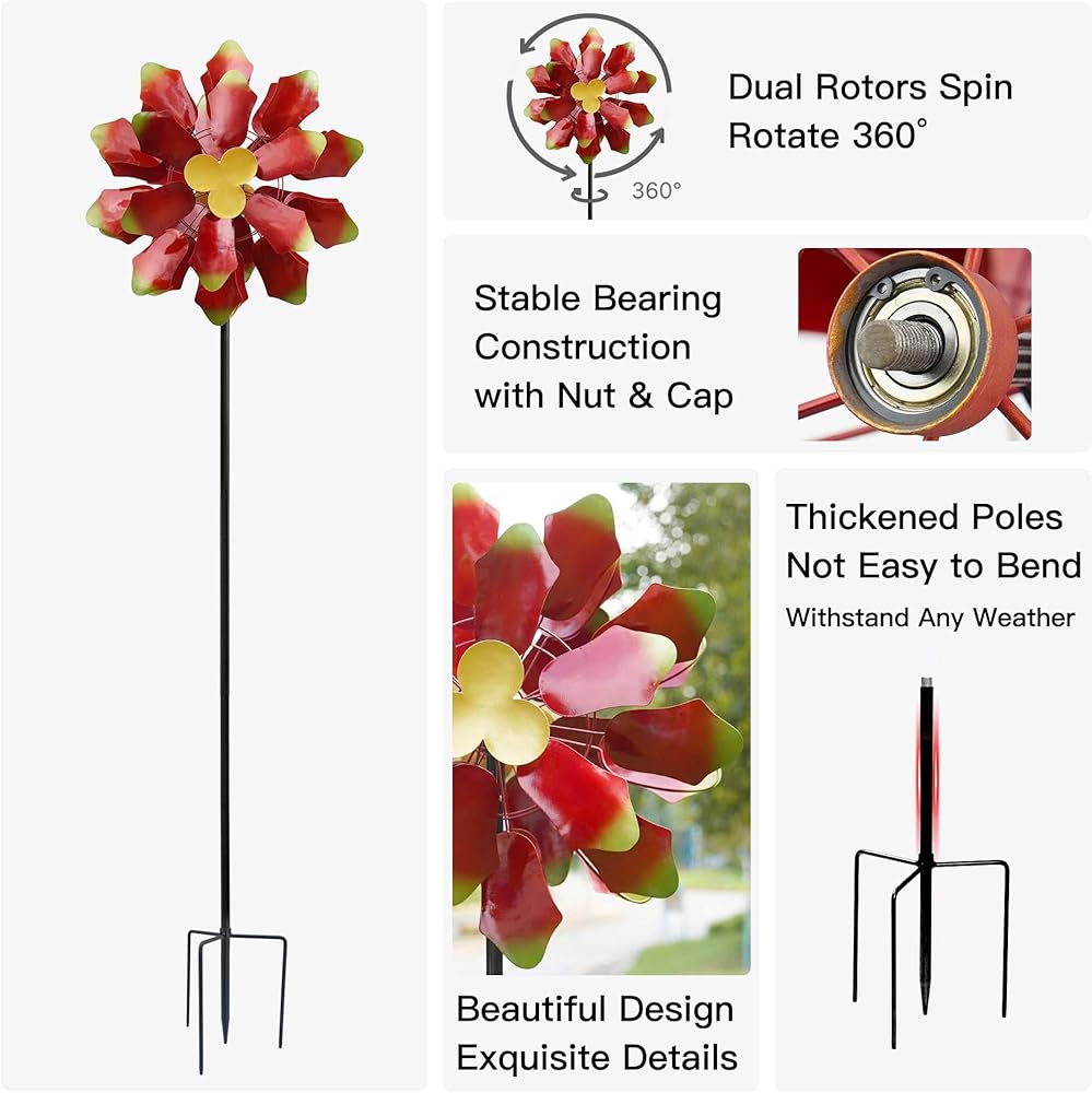 🌺 تصميم أوراق جميل: يتميز هذا الدوار المعدني المذهل بمزيج من اللون الأحمر مع اللون الأصفر. تدور الدوارات المزدوجة بشكل مستقل وتدور 360 درجة. تتميز دوارات الرياح الحركية بأعمدة سميكة (قطر 22 مم) ووتد معدني ثابت بثلاثة شوكات لضمان زراعتها بقوة في الأيام العاصفة وفي مواجهة المناظر الطبيعية الثلجية.