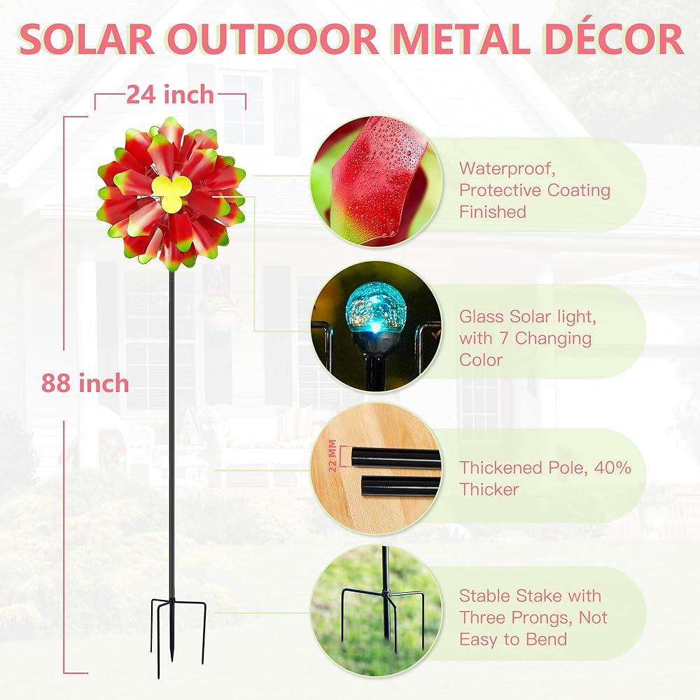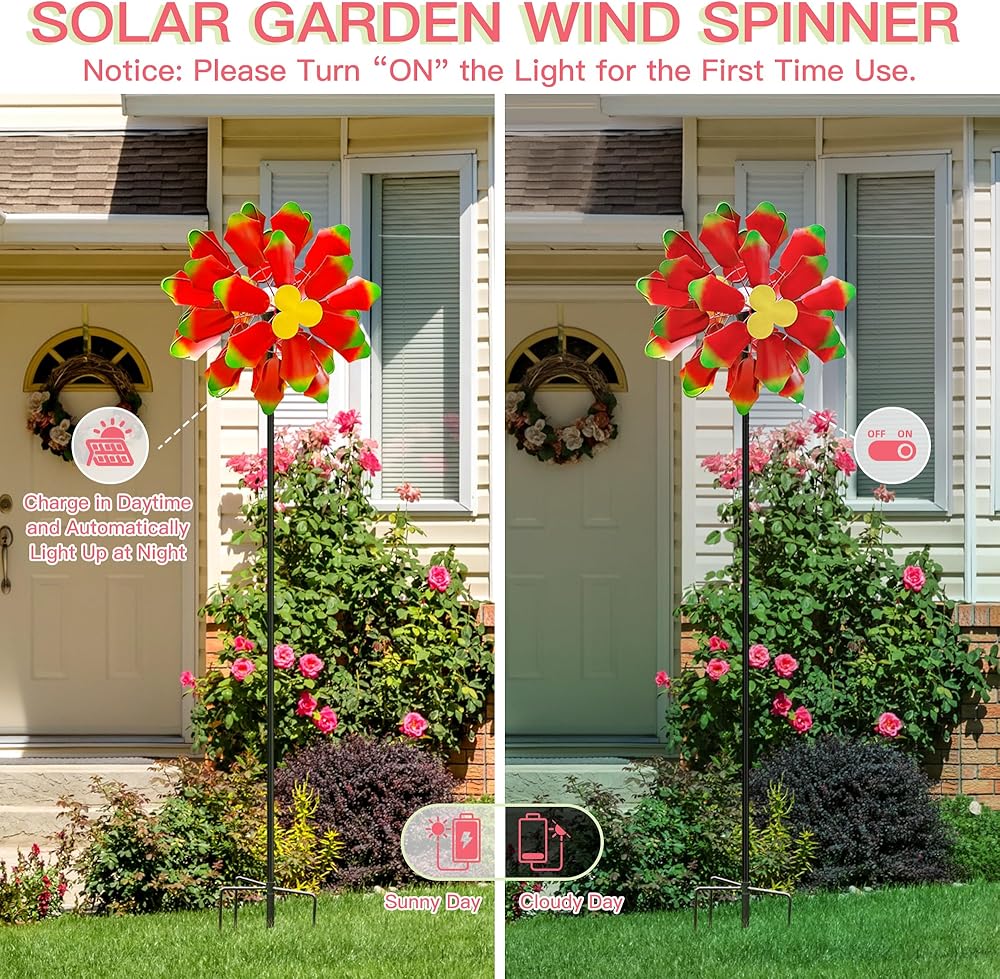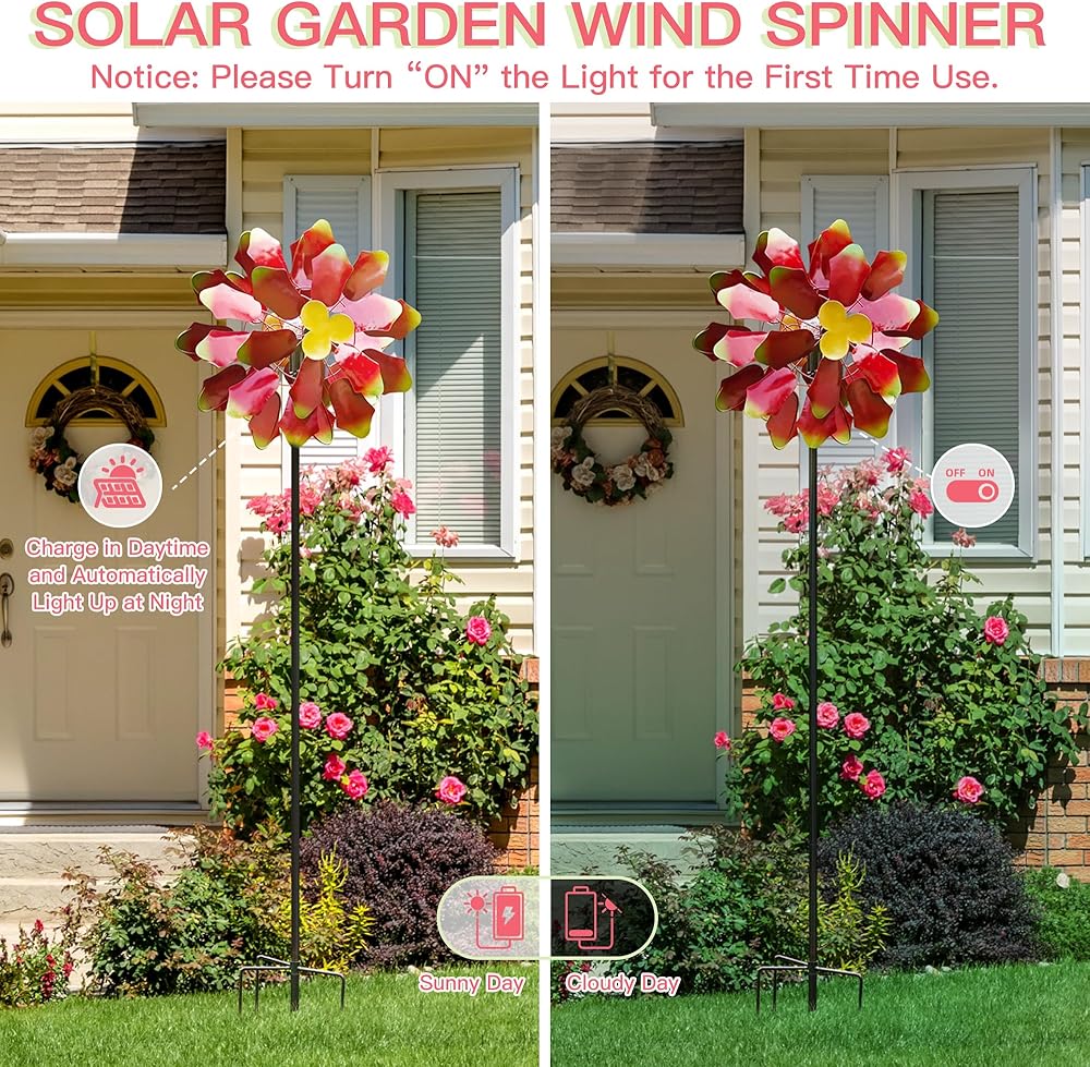 🌺 ديكور معدني خارجي شمسي: مصنوع من معدن قوي مع تشطيبات طلاء واقية. مقاوم للأشعة فوق البنفسجية والصدأ والبهتان. يمكن تنظيف الجزء الدوار المزخرف لجميع المواسم بسهولة للحفاظ على لمعانه العاكس ومظهره الريفي. استخدام طويل الأمد.