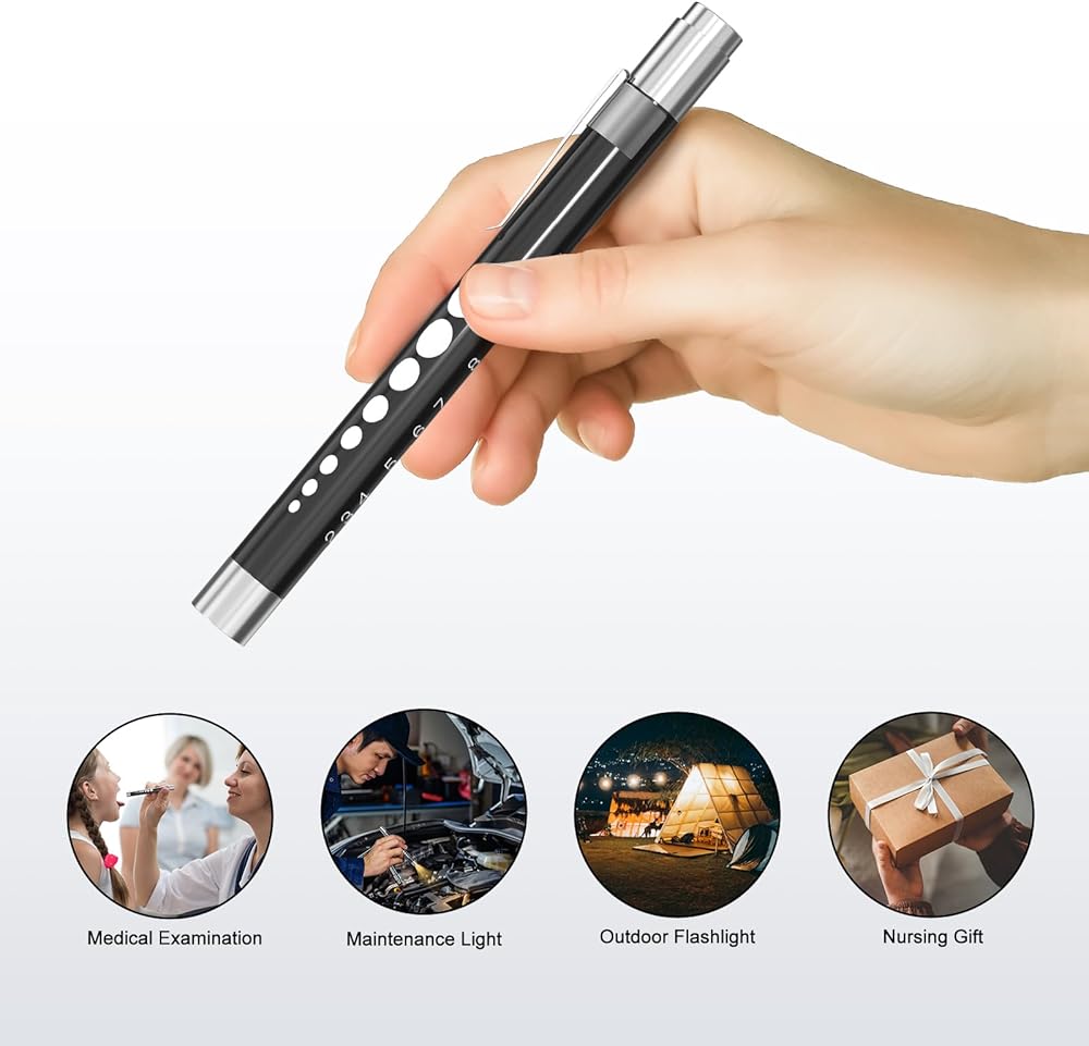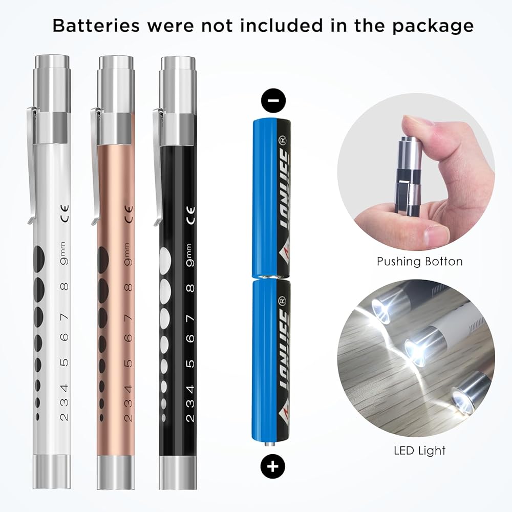 • تشغيل بدون مجهود: تشغيل مصابيح القلم الطبية الخاصة بنا أمر سهل. فهي تتطلب بطاريتين AAA فقط، مما يضمن سهولة الاستخدام. إنها بمثابة الرفيق المثالي للفحوصات الطبية والأنشطة الخارجية (ملاحظة: البطاريات غير متضمنة).