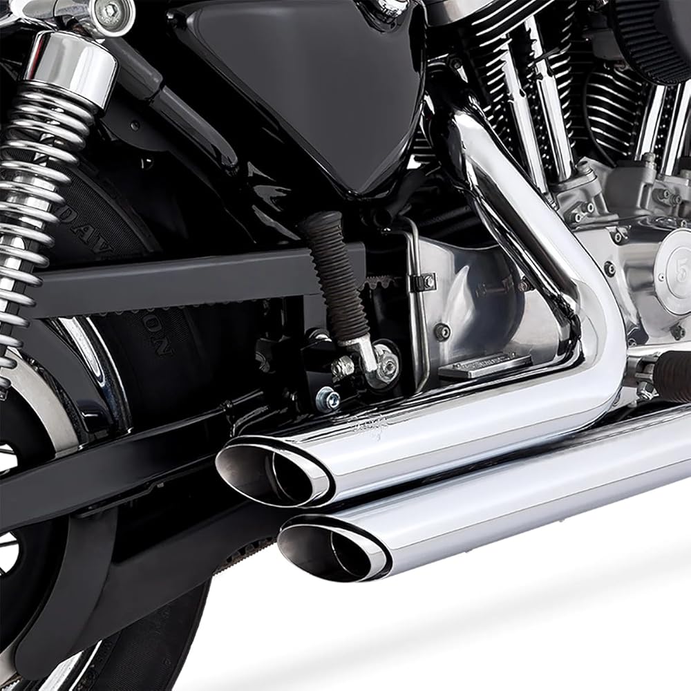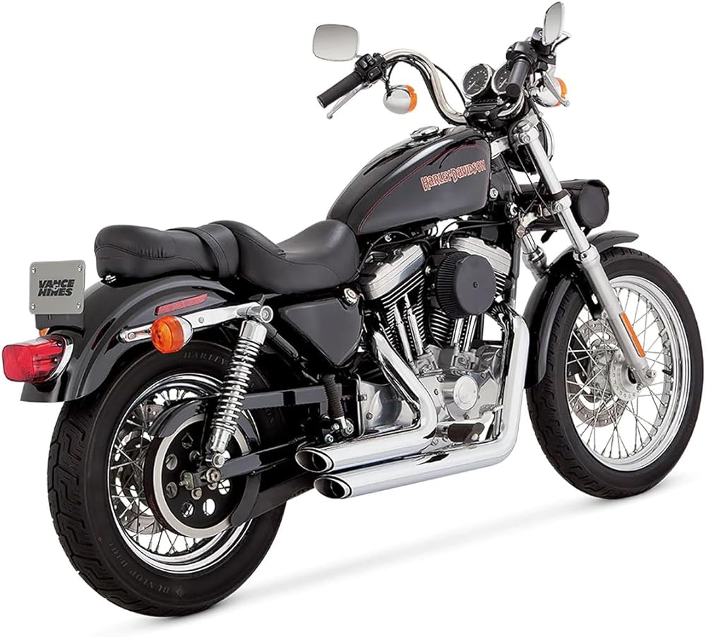 A revolution in blue-proof exhaust technology, Vance & Hines delivers the short, fat, straight-pipe look with twin slash-cut ends High style and performance combined with unbeatable value 1 3/4" head pipes with 220 deg coverage heat shields Includes removable baffles, mounting hardware and instructions Black pipes feature full coverage heat shields coated with a race-quality black ceramic contrasted with a signature chrome badge and end treatment Optional quiet baffle available ( sold separately) Made in the U.S.A. Fits: '99-'03 Harley XL Sportster models