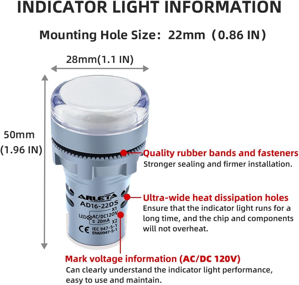 【مادة ضوء المؤشر】يعتمد ضوء المؤشر على مثبتات عالية الجودة مع موصلية قوية. يستخدم على نطاق واسع في الطاقة الكهربائية والاتصالات والأدوات الآلية والمحرك والأجهزة المنزلية.