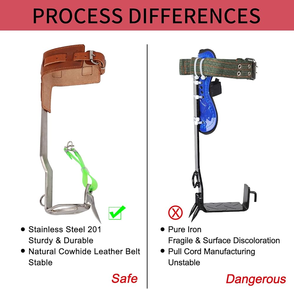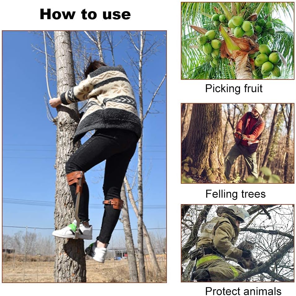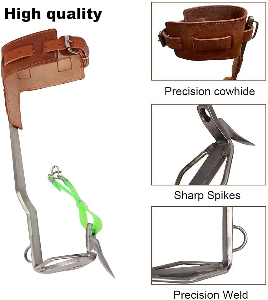 جودة عالية: مخارز شجرة التسلق مصنوعة من لحام الفولاذ المقاوم للصدأ. تم تعزيز المسامير. حاد جدا. مقاوم للصدأ ومقاوم للاهتراء. الحزام معالج من أفضل أنواع جلود البقر. يقلل بشكل فعال من احتكاك تسلق الأشجار على ساقيك.