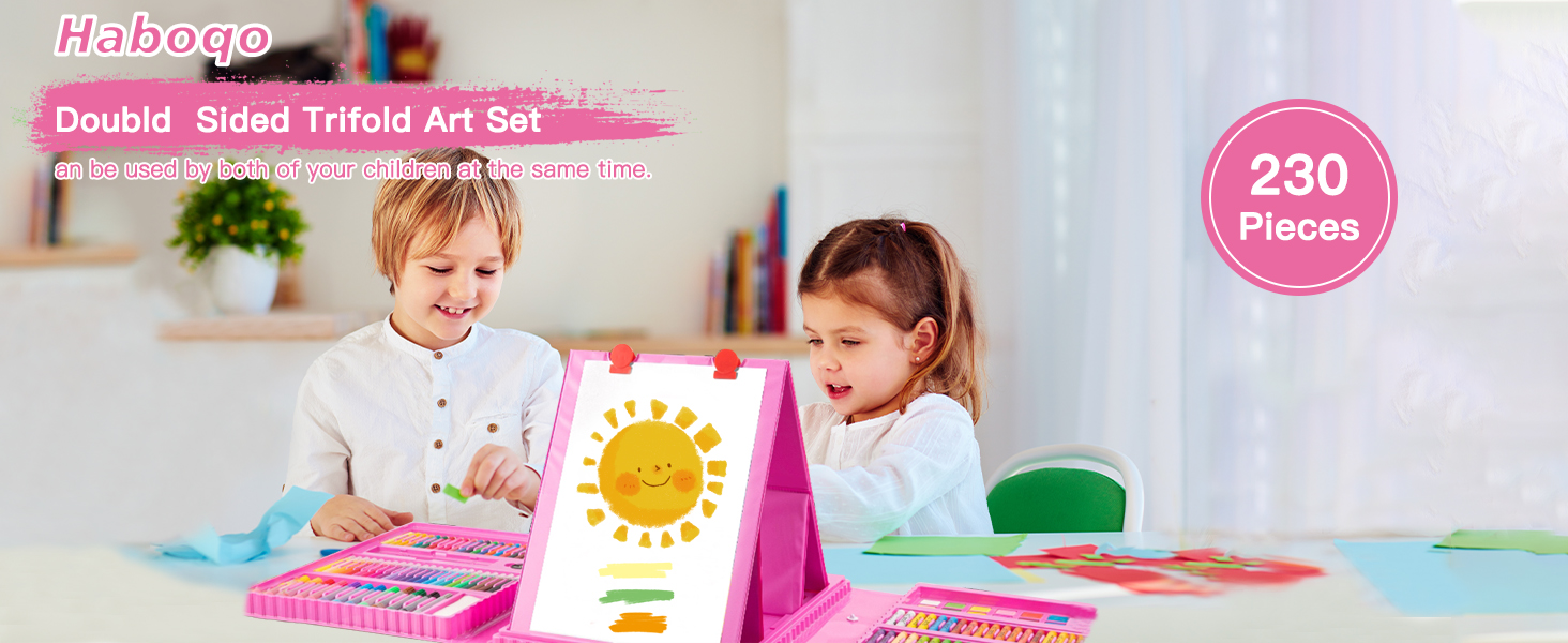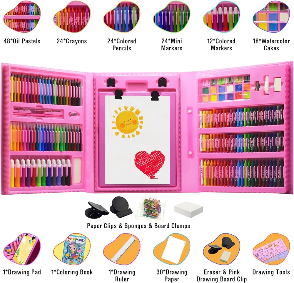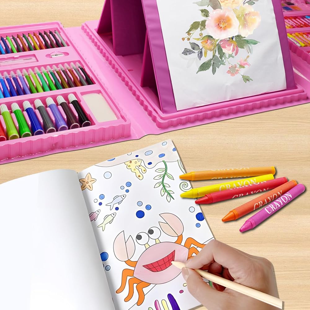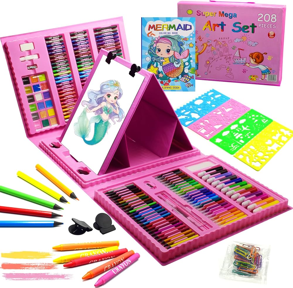 لوازم فنية للأطفال، 230 قطعة حافظة فنية للرسم للفتيات مع حامل ثلاثي الجوانب مزدوج، كتب تلوين وأقلام تلوين وأقلام رصاص ملونة، هدايا مواد رسم إبداعية للفنانين المبتدئين