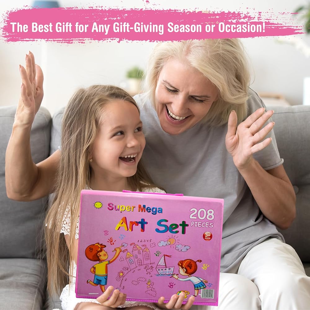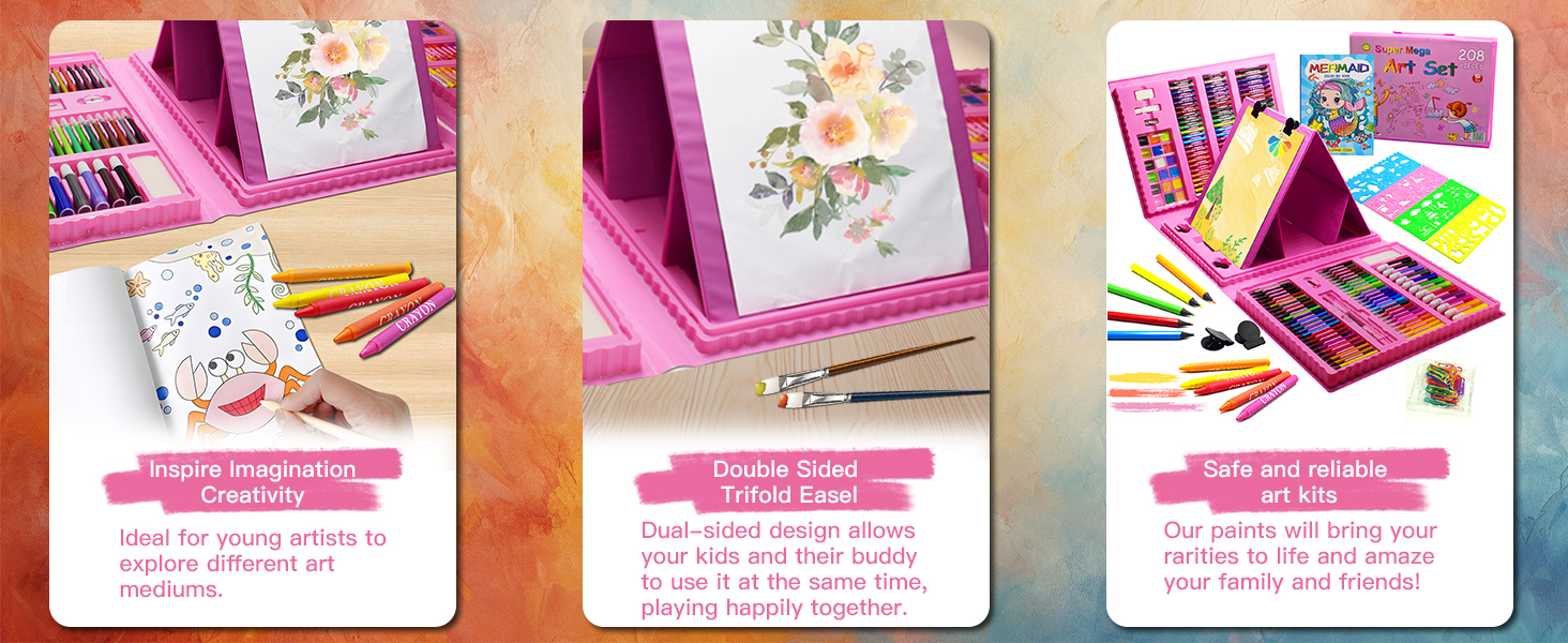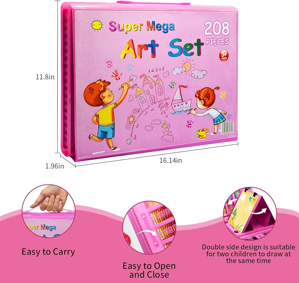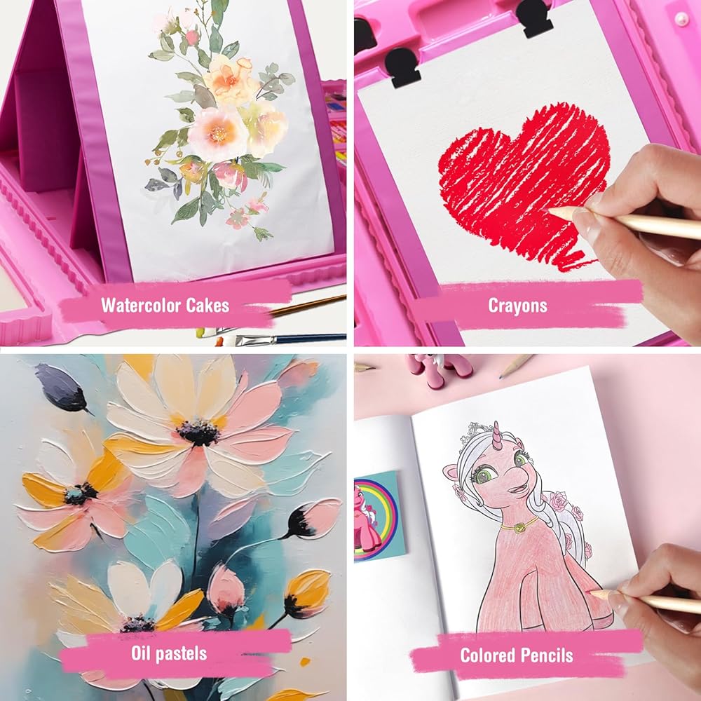 لوازم فنية للأطفال، 230 قطعة حافظة فنية للرسم للفتيات مع حامل ثلاثي الجوانب مزدوج، كتب تلوين وأقلام تلوين وأقلام رصاص ملونة، هدايا مواد رسم إبداعية للفنانين المبتدئين