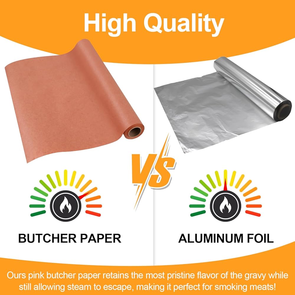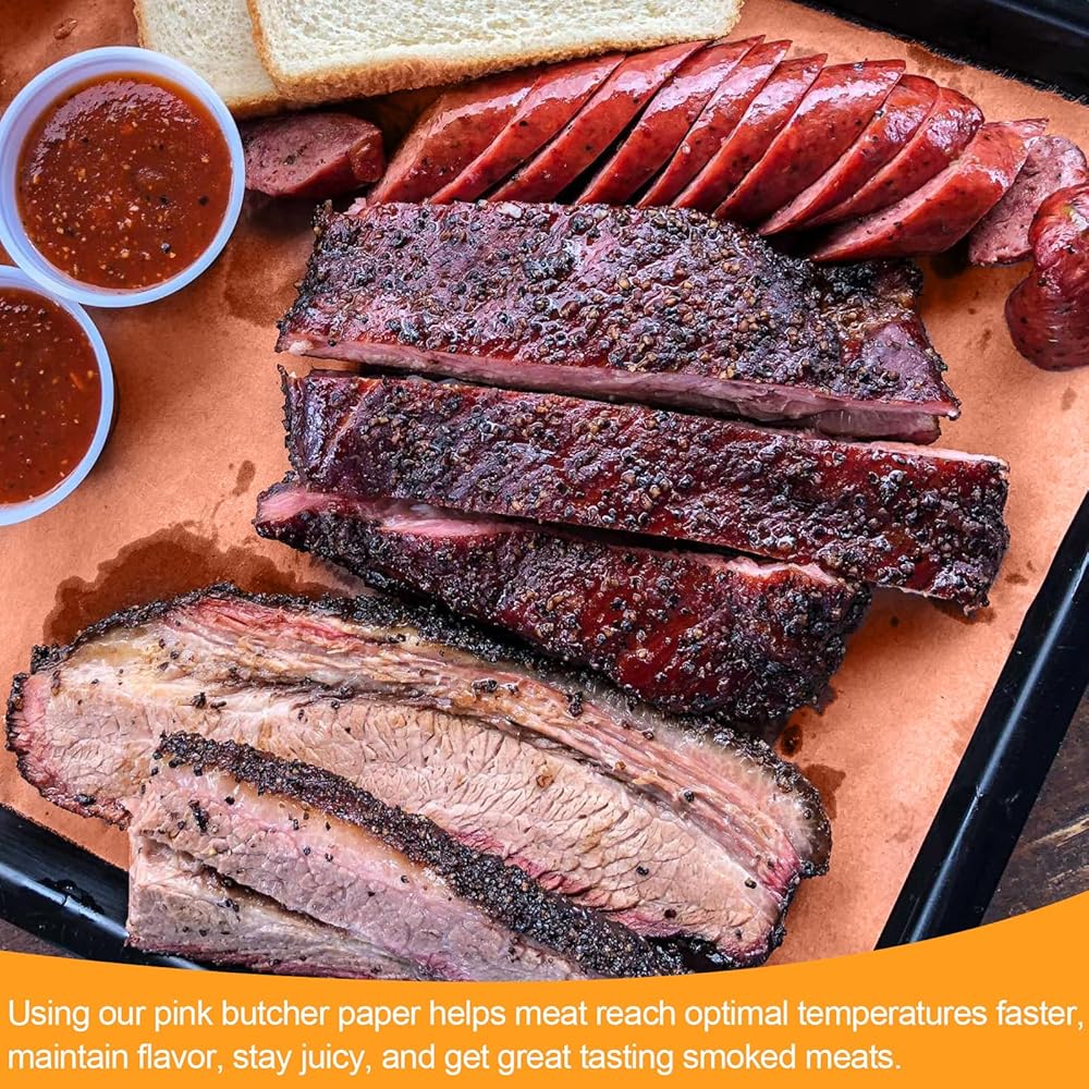 ورق آمن غذائيًا: لفة ورق الجزار الوردية الخاصة بنا آمنة للاتصال المباشر بالطعام، لذا لا تتردد في استخدامها. تحتفظ لفة ورق الجزار الوردي بنكهة المرق الأكثر نقاءً بينما تسمح للبخار بالهروب، مما يجعلها مثالية لتدخين اللحوم!
