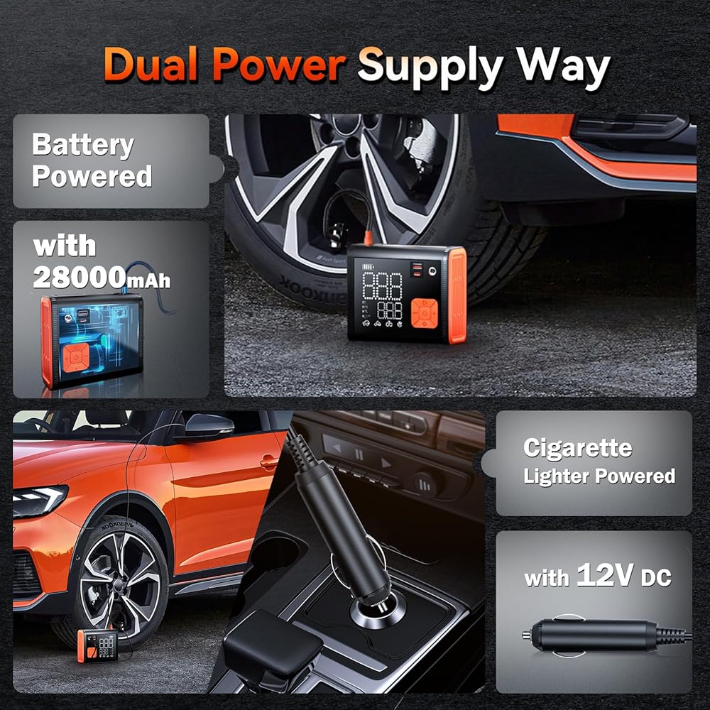 • [المزيد من الميزات] ليس مجرد ضاغط هواء يعمل بالبطارية للسيارة، بل أيضًا مع إضاءة عالية السطوع وميزات التنبيه وشاشات LCD المزدوجة، فهو يضمن الاستخدام المريح. إن قدرة البطارية التي تبلغ سعتها 28000 مللي أمبير في الساعة تجعلها مصدر طاقة موثوقًا أثناء التنقل لأجهزتك الإلكترونية.