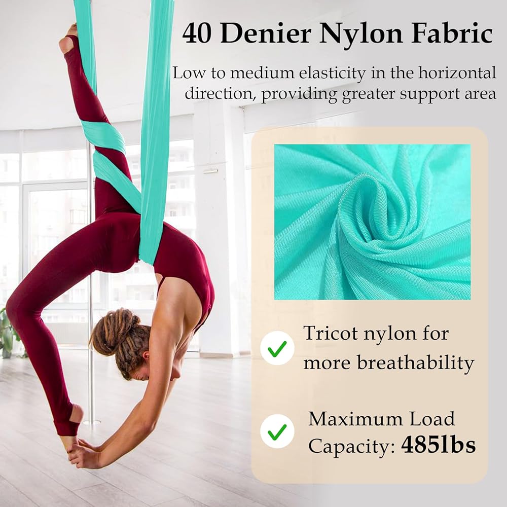 نايلون فاخر 40D: أرجوحة اليوجا الهوائية مصنوعة من تريكو نايلون 40 دينير مع تمدد منخفض إلى متوسط. القماش جيد التهوية وناعم ومتين للغاية. وهذا يجعل من السهل تسلق حرير اليوغا ويوفر توسيدًا للتقلبات.