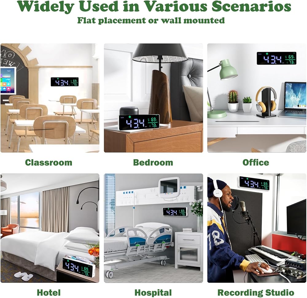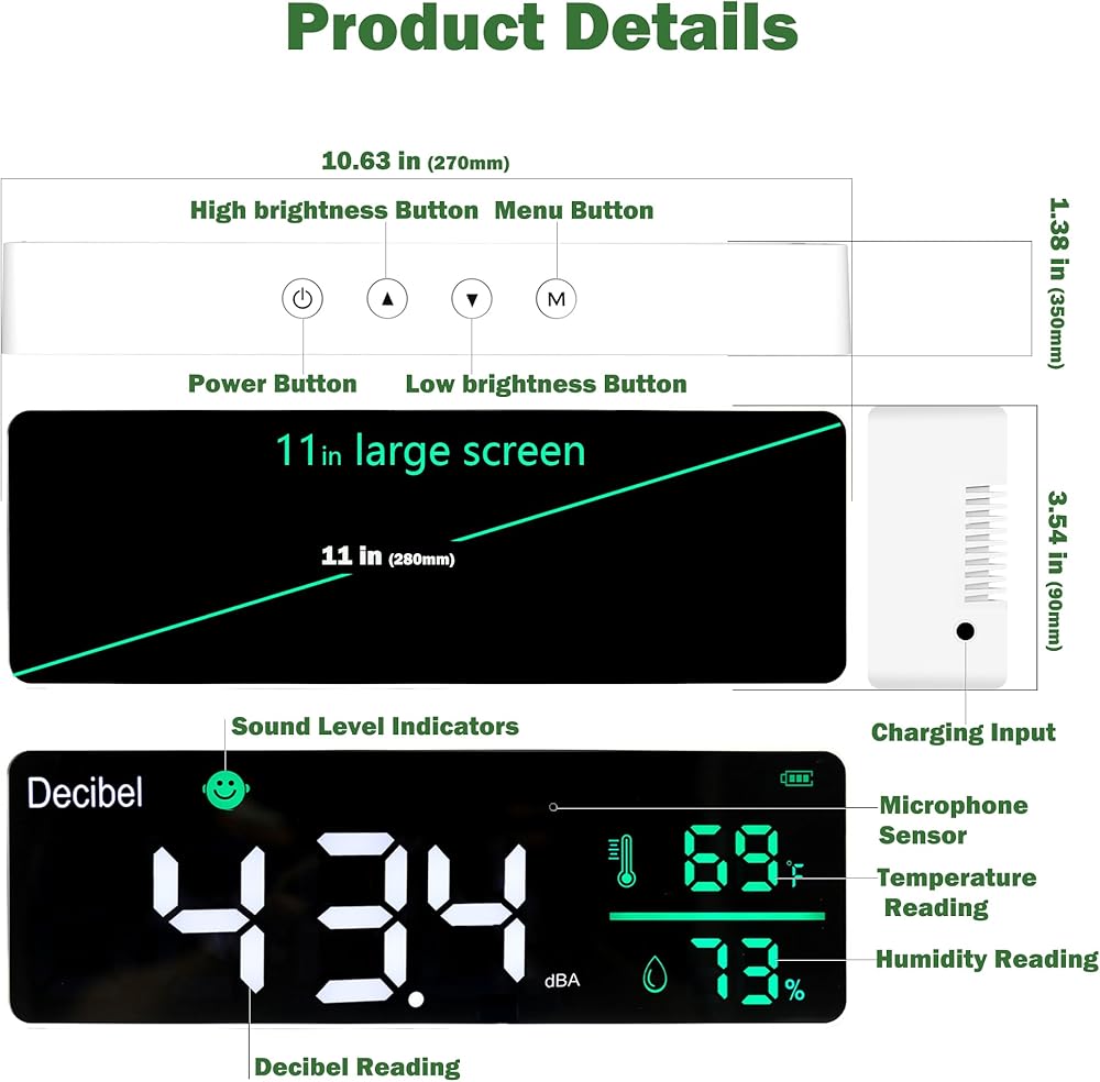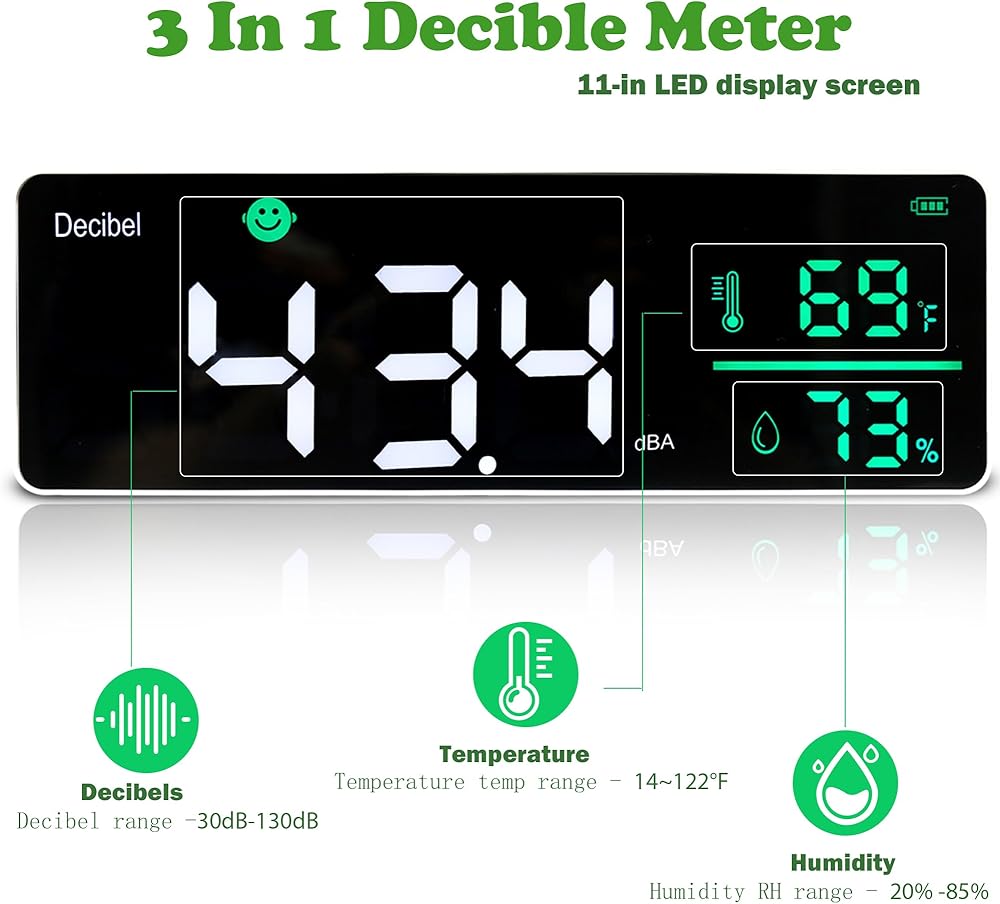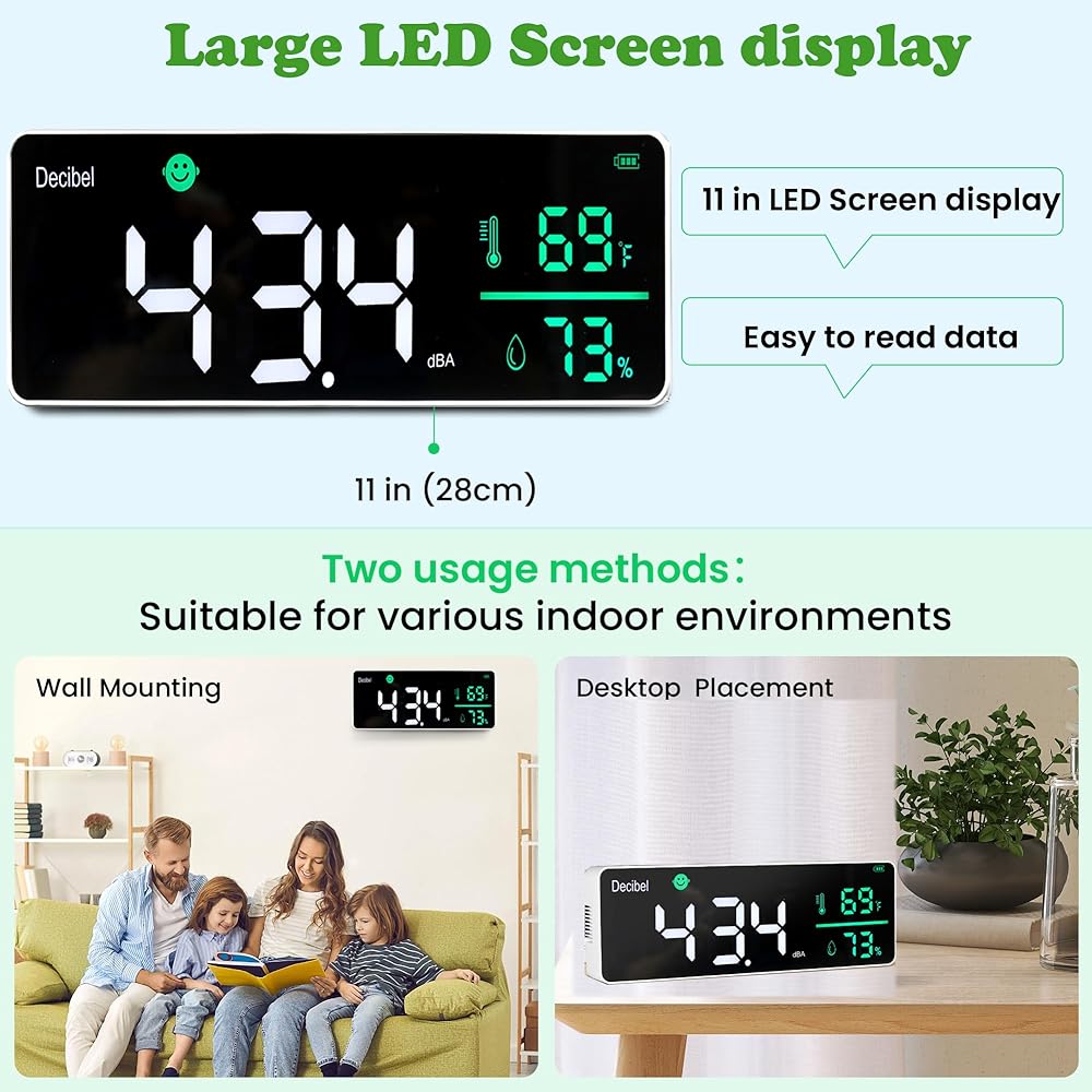 جهاز قياس مستوى الصوت 3 في 1 ديسيبل لمراقبة مستوى الصوت للتعليق على الحائط مع شاشة LED كبيرة مقاس 11 بوصة مقياس الضوضاء ودرجة الحرارة والرطوبة يستخدم على نطاق واسع للمنزل والفصول الدراسية والاستوديو والمصنع