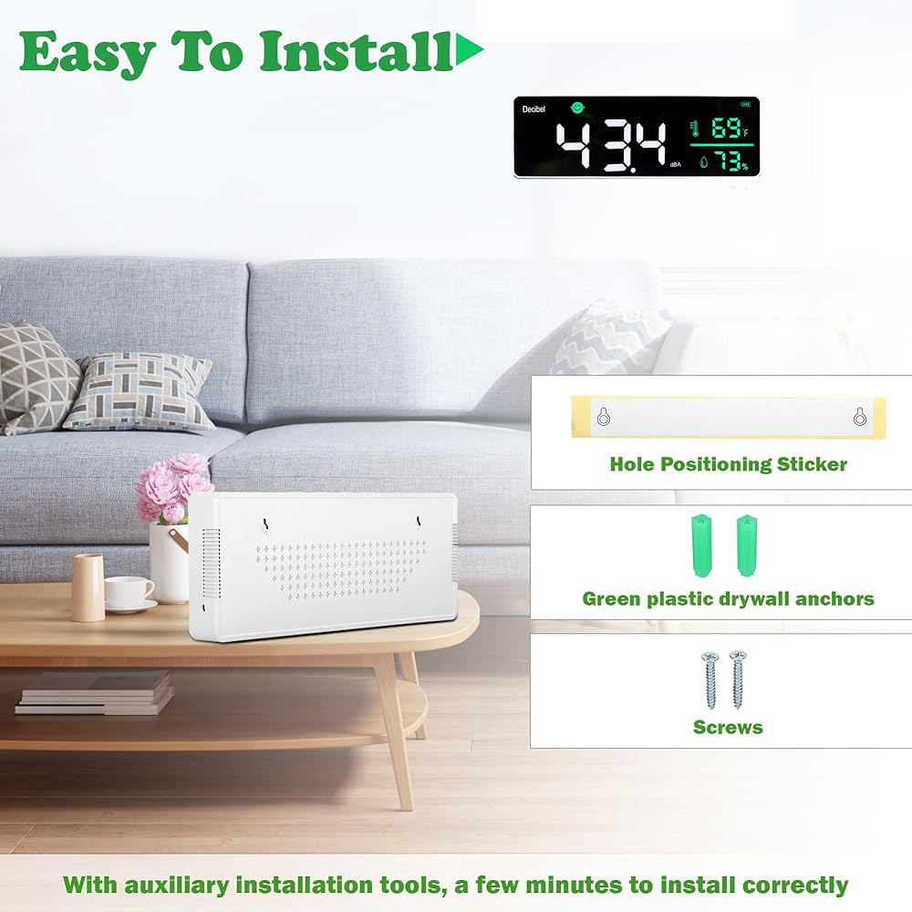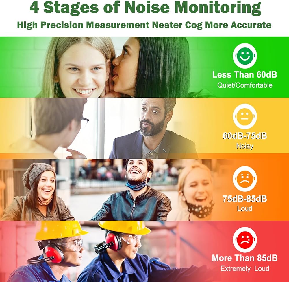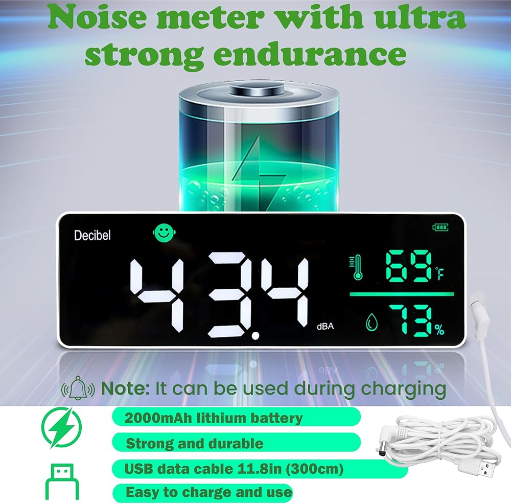 【تطبيقات واسعة】: يمكن وضع مقياس الديسيبل بشكل مسطح على سطح المكتب أو استخدامه كجهاز مثبت على الحائط. يمكن استخدام مقياس ديسيبل الصوت في الفصول الدراسية وطرق المرور والمصانع ومواقع البناء والمنازل والمكاتب وما إلى ذلك. يساعد مقياس ديسيبل الضوضاء الصناعات والمجالات المختلفة في الحفاظ على بيئات صوتية مناسبة، ومنع التلوث الضوضائي، وحماية سمع الناس ونوعية حياتهم .