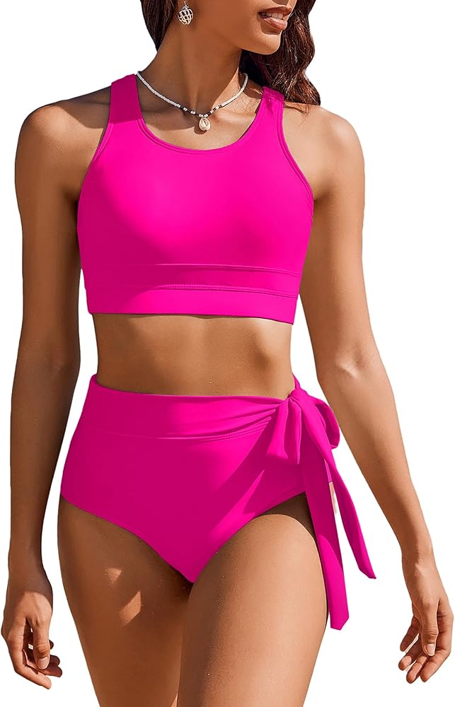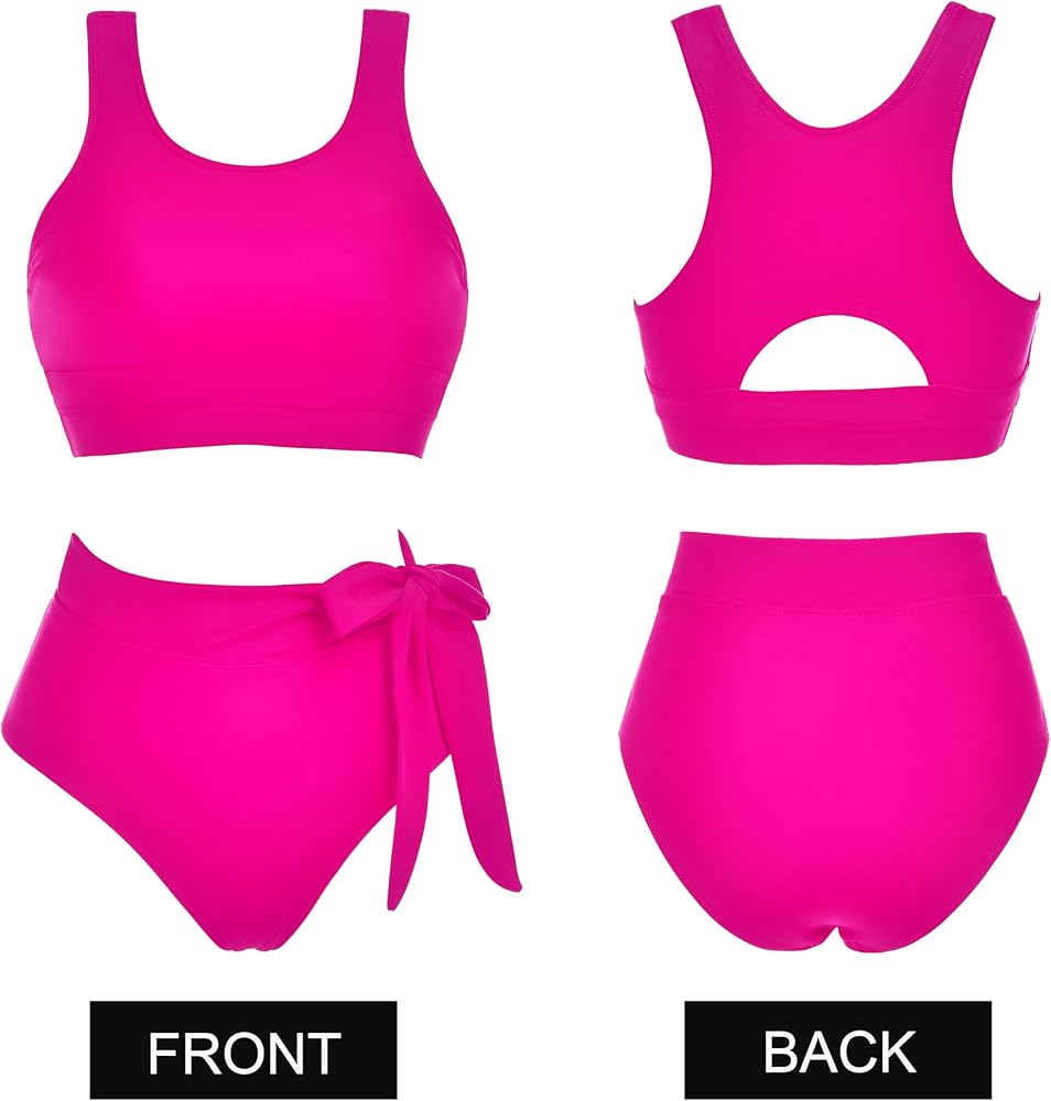 - المميزات - تم تصميم ملابس السباحة النسائية عالية الخصر ببطانة قابلة للإزالة، ورقبة واسعة، وجزء علوي بظهر متسابق، وجزء سفلي بيكيني عالي القطع، وعقدة جانبية.