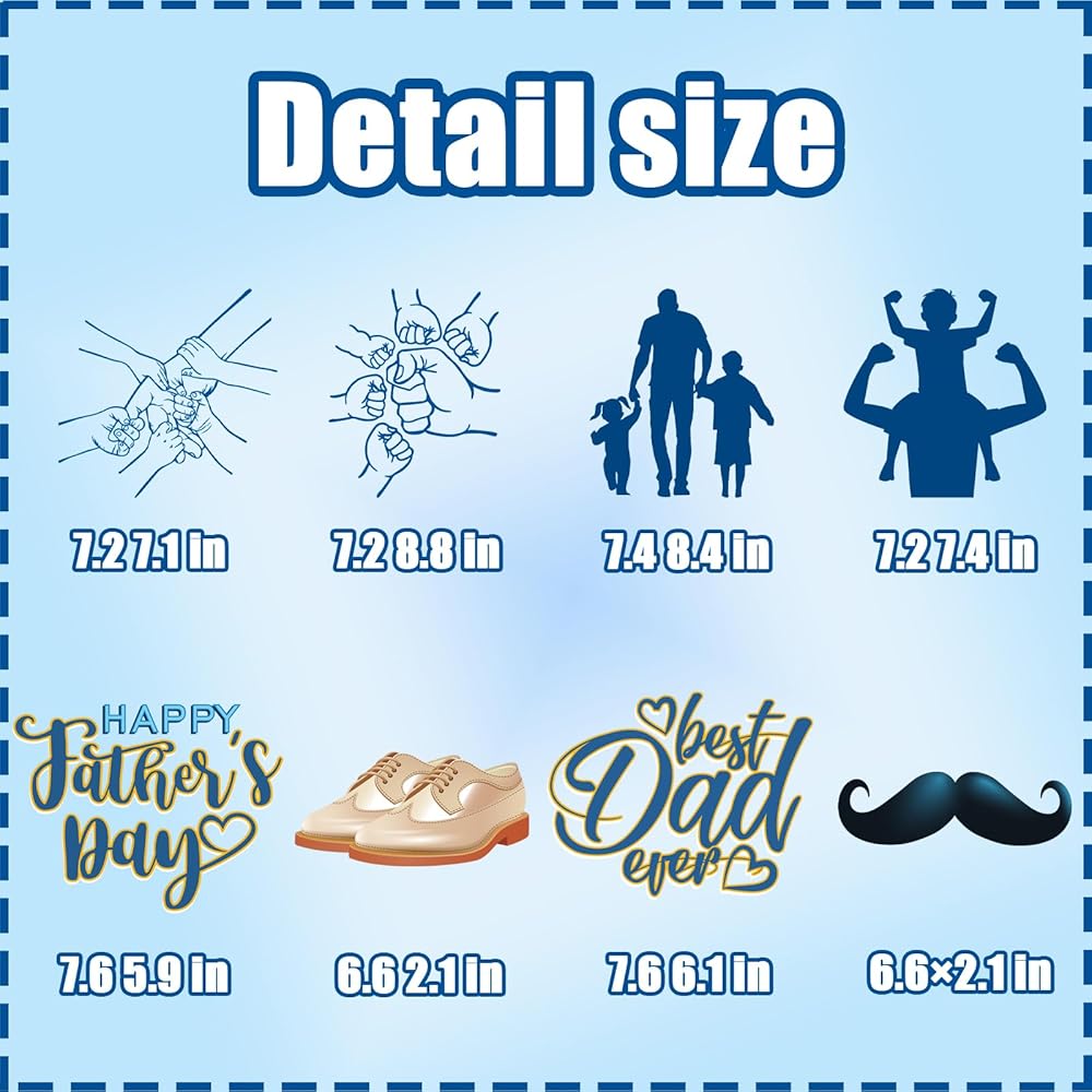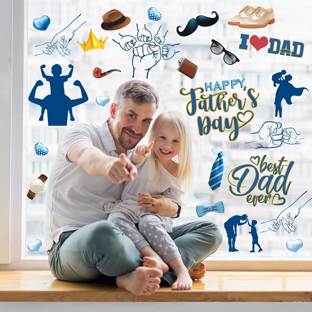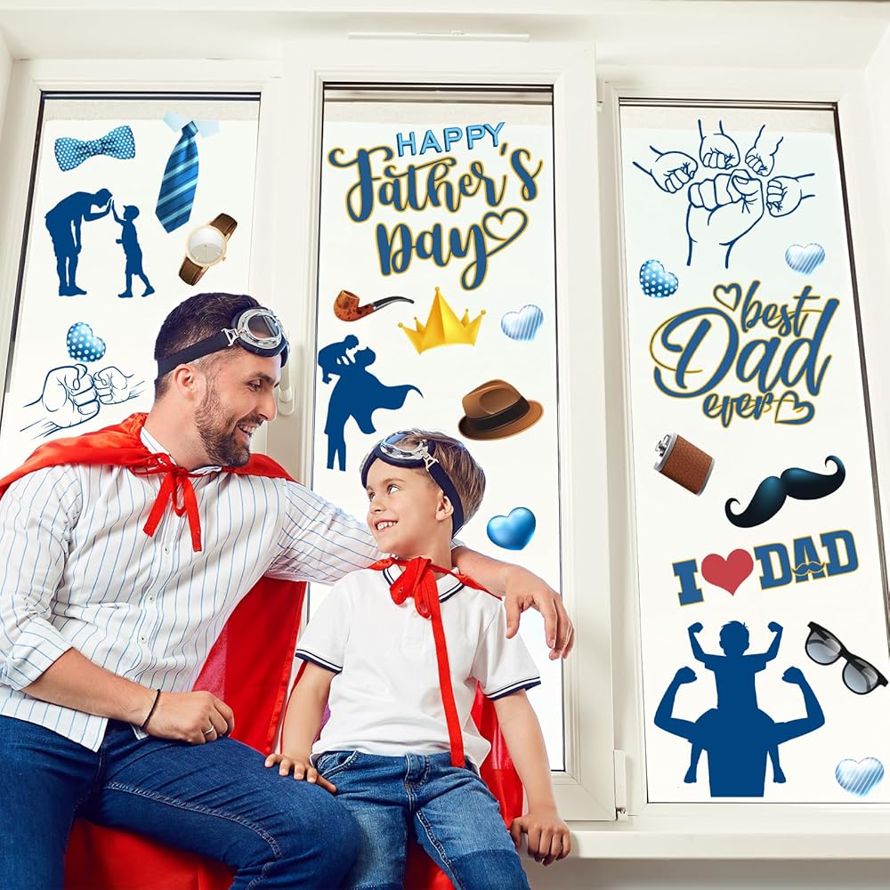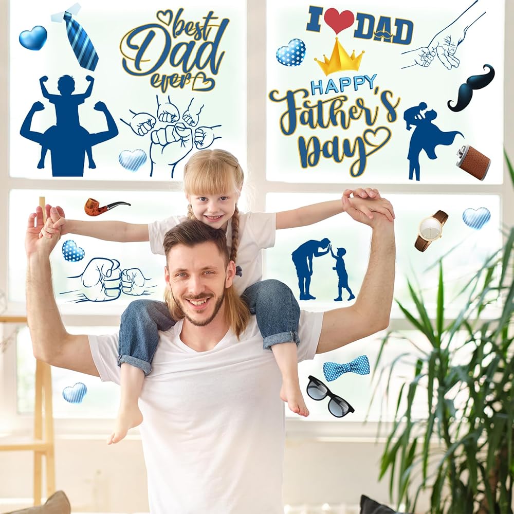 【التصميم】تم تصميم ملصقات النوافذ لعيد الأب مع موضوع الأب. تحتوي ملصقات عيد الأب على أنماط مختلفة من الأب، والأطفال، والساعة، والغليون، واللحية، وربطة العنق، وما إلى ذلك، مما يجعلها مناسبة جدًا لديكور عيد الأب.