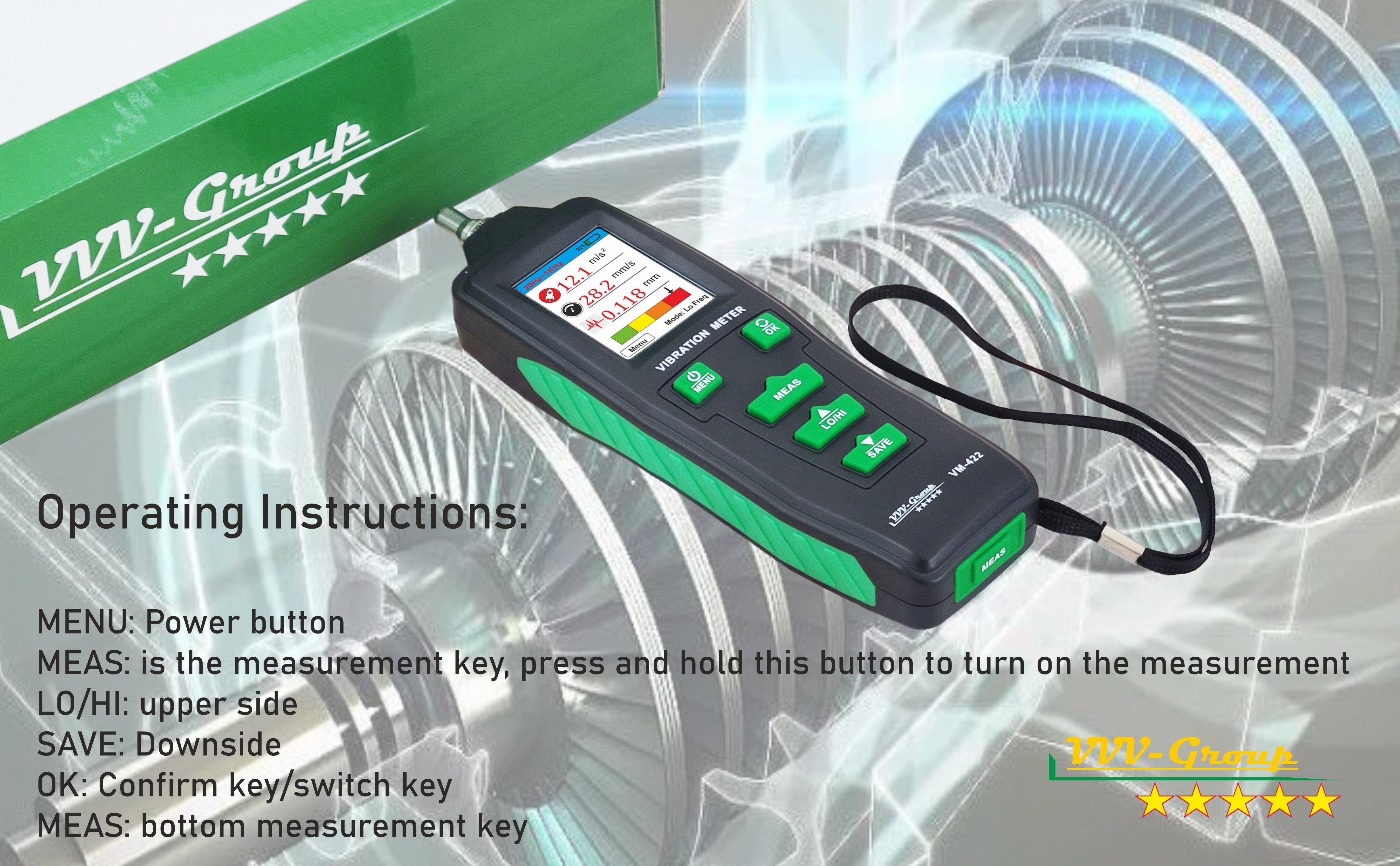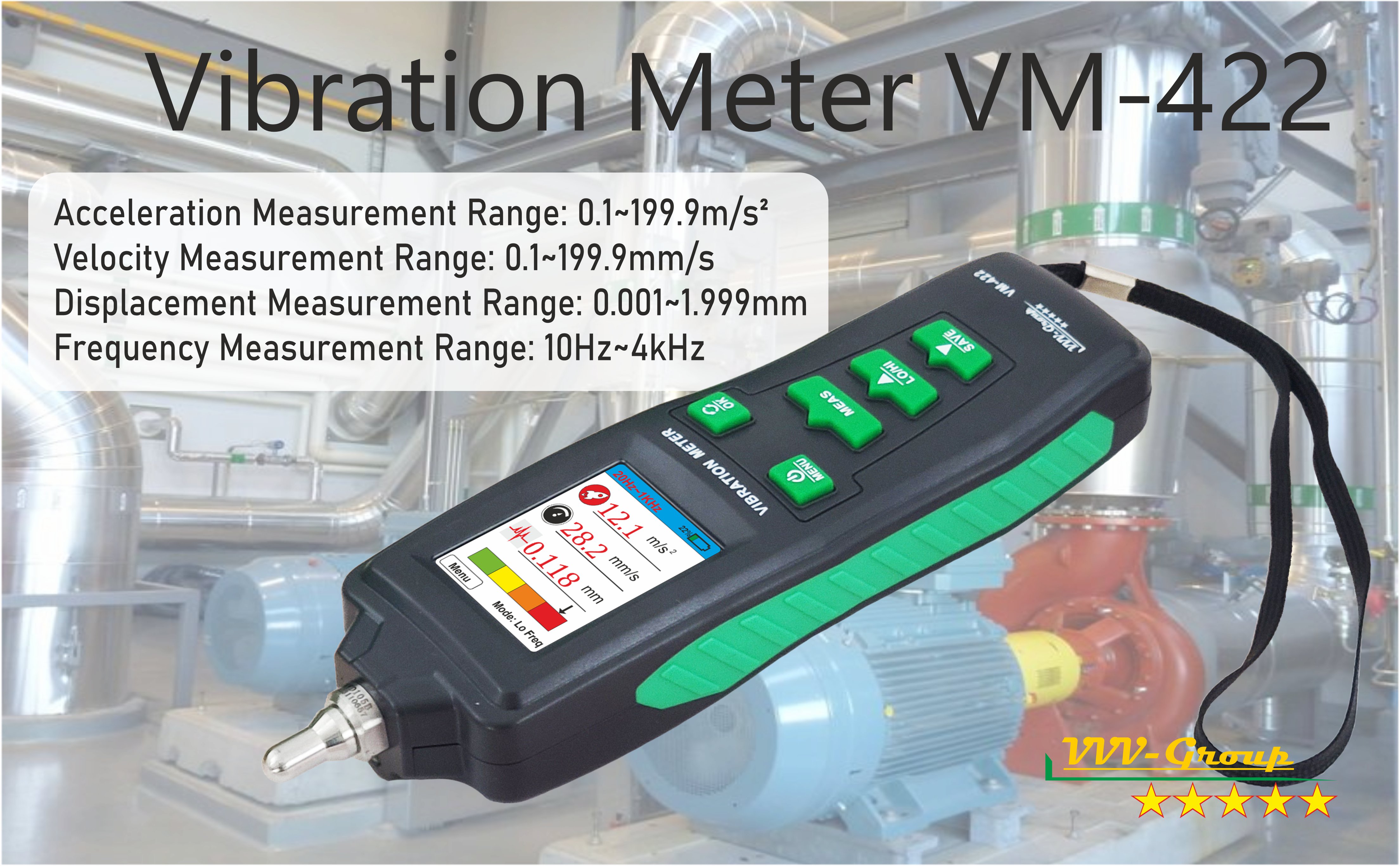 يساعدك مقياس الاهتزاز VM-422 على التنبؤ بالفشل وتجنبه في وقت مبكر. يُستخدم مقياس الاهتزاز في العديد من التطبيقات، بشكل أساسي لمراقبة حالة المحركات وأجهزة التدفئة والتهوية وتكييف الهواء والمحركات والمولدات والمضخات والمراوح والضواغط والتوربينات