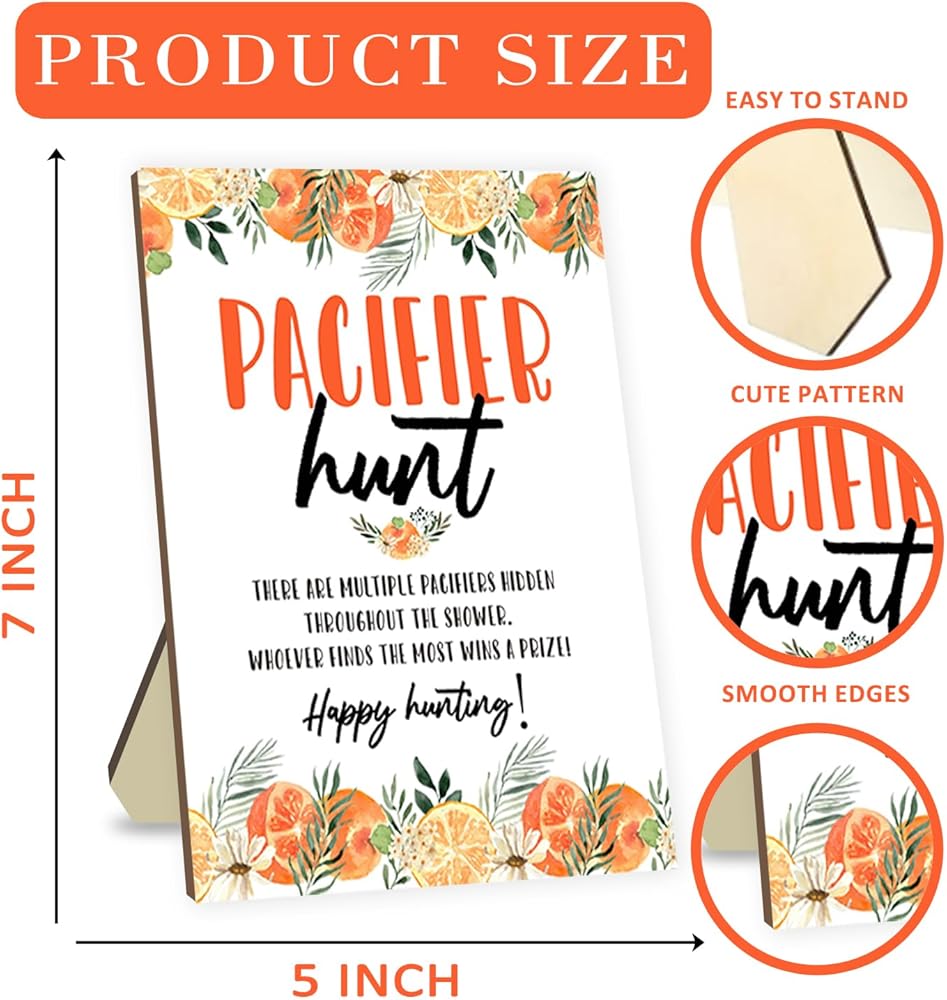 DESIRABLE SIZE: The pacifier hunt game sign measures 5 X 7 inches and it is designed with a stand, which can stand independently on the desktop to attract more people's attention. The size of the acrylic pacifier is about 0.51 X 0.79 inches, the compact size is easy to hold and play with in the hand.