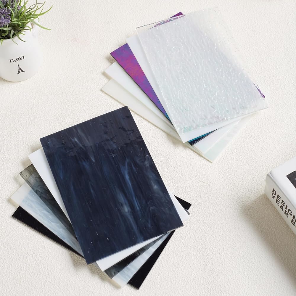 Inside, you'll discover iridescent sheets for a touch of shimmer, semi-transparent pieces for subtle elegance, opaque gems for bold statements, solid colors for classic simplicity, and textured glass for added depth. To top it off, we've included an iridescent textured clear sheet – a versatile addition that opens up a world of design possibilities.