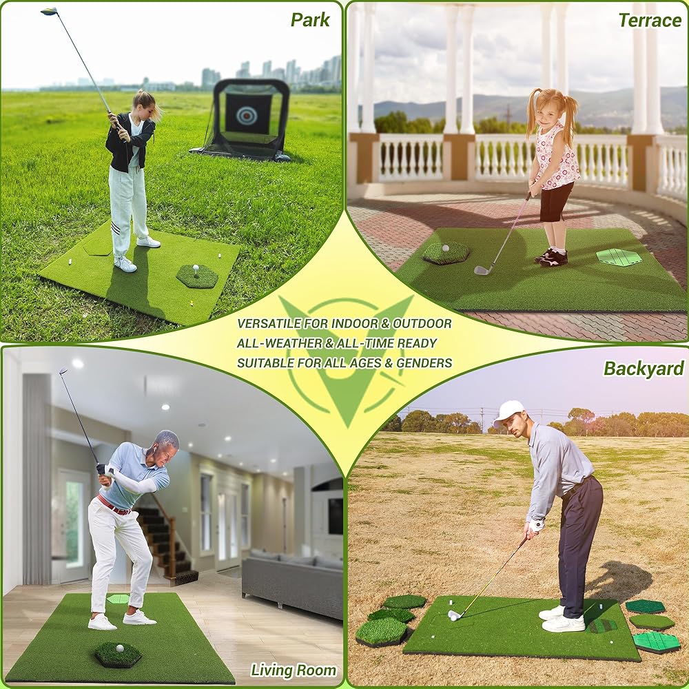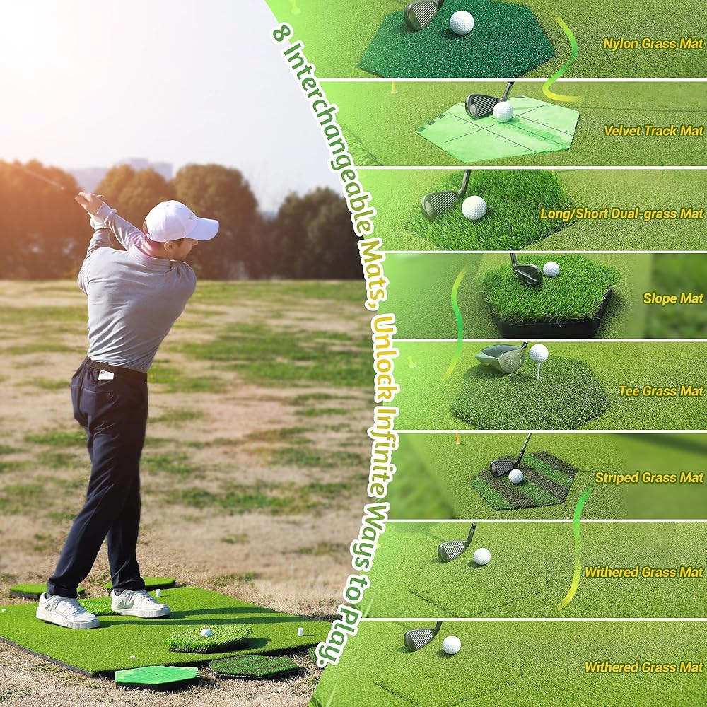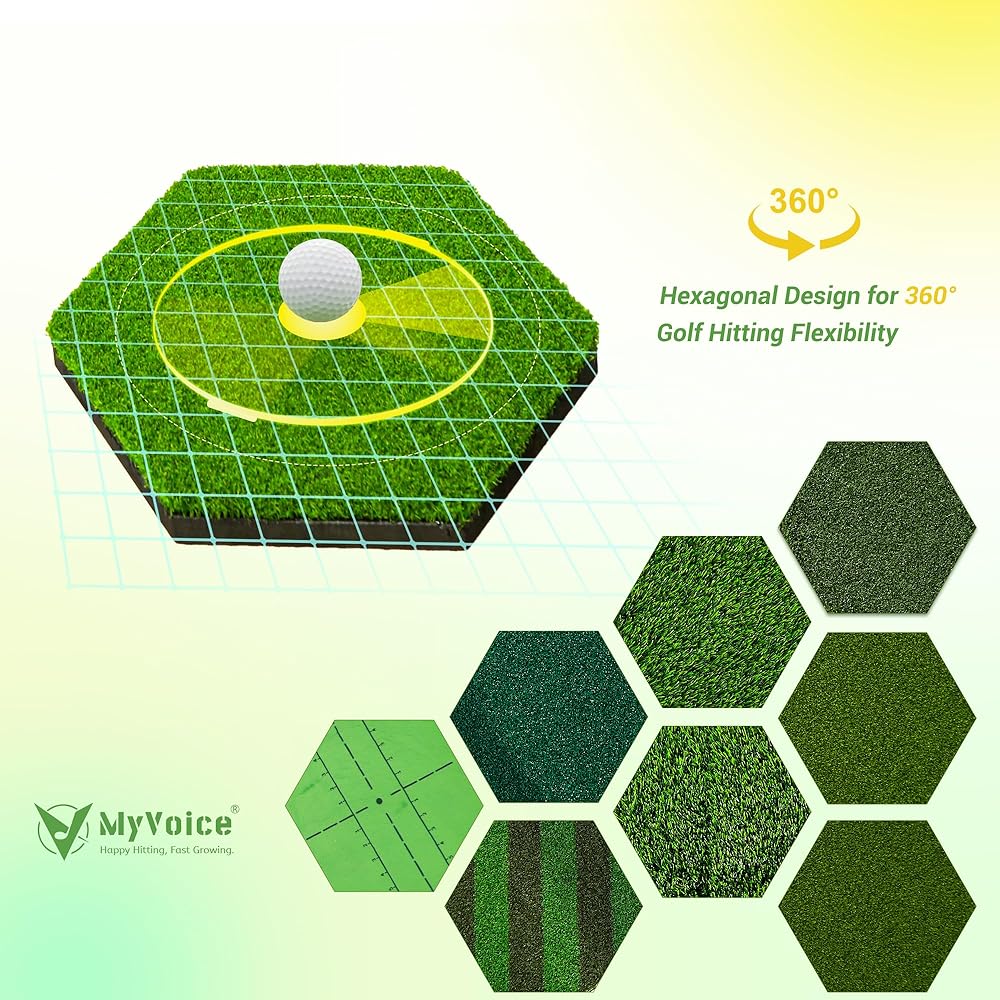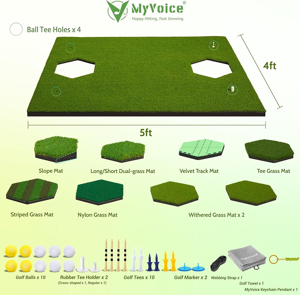 Introducing premium upgraded MyVoice golf mat, the ultimate practice companion for golf enthusiasts of all ages and skill levels. Designed for both indoor and outdoor use, this versatile and multifunctional golf mat is perfect for honing your swing, chipping, and driving skills. Measuring 5x4ft, our golf mat features a total thickened (31mm) base with premium upgraded turf that offers enhanced impact resistance for extended durability. The 8 insert mats (Withered Grass Mat x2, Slope Mat x1, Striped Grass Mat x1, Tee Grass Mat x1, Velvet Track Mat x1, Long/Short Dual-grass Mat x1, Nylon Grass Mat x1) are uniquely designed each with a hexagonal pattern, providing you with 360-degree golf hitting flexibility. Whether you're practicing at the driving range or in your backyard, our golf chipping mat ensures a realistic and authentic golfing experience. The embossed anti-slip EVA base design keeps the mat securely in place during your swings, providing stability and preventing any unwanted slips. Portable and easy to carry, our golf impact mat can be conveniently stored and transported wherever you go. Plus, it includes all the necessary accessories for your golf training needs. This outdoor golf mat is suitable for everyone, from men and women to boys and girls of all ages. Whether you're a seasoned golfer looking to improve your swing or a beginner learning the ropes, our golf practice swing mat is the perfect tool to take your game to the next level. Invest in the best and elevate your golfing experience with our premium upgraded golf turf practice mat. Order now and start practicing like a pro!