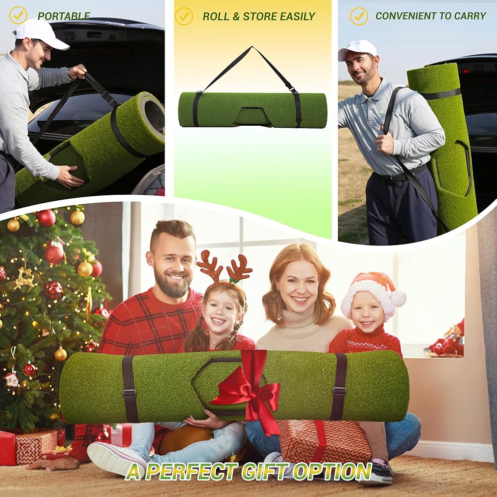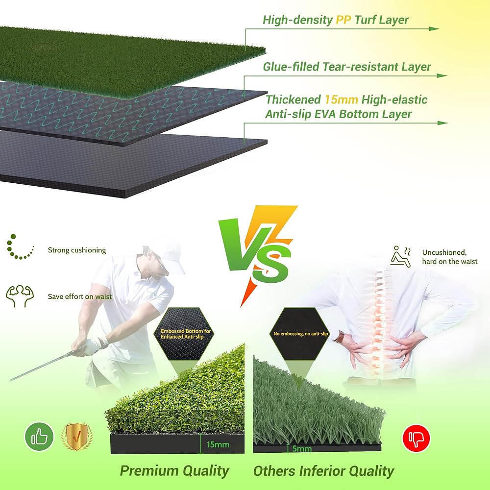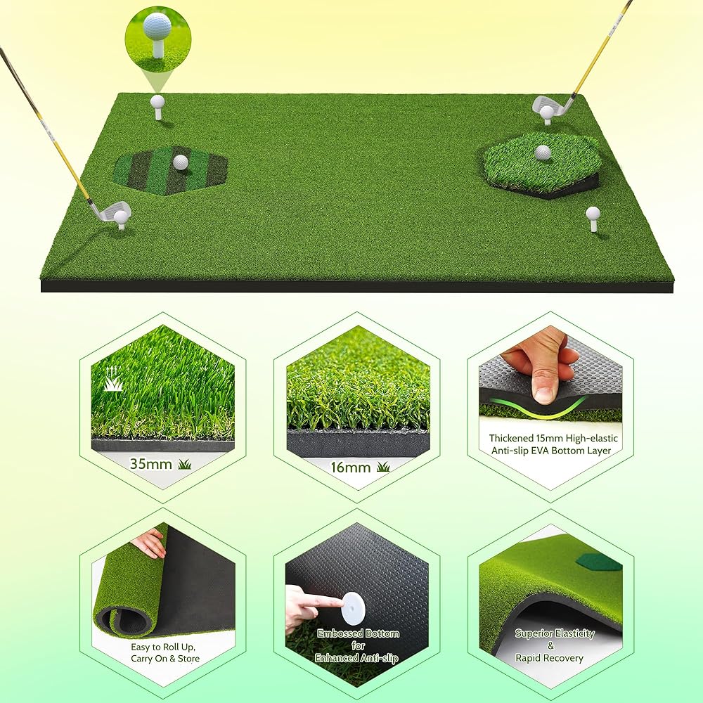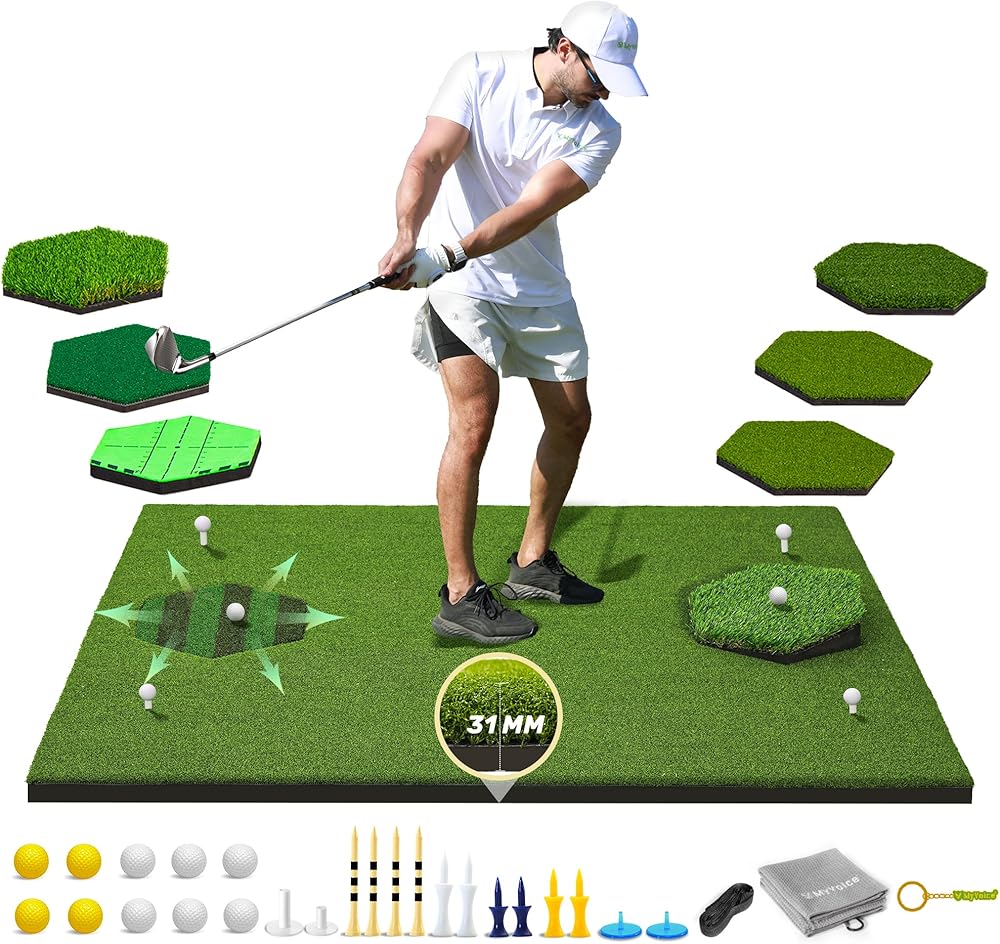Introducing premium upgraded MyVoice golf mat, the ultimate practice companion for golf enthusiasts of all ages and skill levels. Designed for both indoor and outdoor use, this versatile and multifunctional golf mat is perfect for honing your swing, chipping, and driving skills. Measuring 5x4ft, our golf mat features a total thickened (31mm) base with premium upgraded turf that offers enhanced impact resistance for extended durability. The 8 insert mats (Withered Grass Mat x2, Slope Mat x1, Striped Grass Mat x1, Tee Grass Mat x1, Velvet Track Mat x1, Long/Short Dual-grass Mat x1, Nylon Grass Mat x1) are uniquely designed each with a hexagonal pattern, providing you with 360-degree golf hitting flexibility. Whether you're practicing at the driving range or in your backyard, our golf chipping mat ensures a realistic and authentic golfing experience. The embossed anti-slip EVA base design keeps the mat securely in place during your swings, providing stability and preventing any unwanted slips. Portable and easy to carry, our golf impact mat can be conveniently stored and transported wherever you go. Plus, it includes all the necessary accessories for your golf training needs. This outdoor golf mat is suitable for everyone, from men and women to boys and girls of all ages. Whether you're a seasoned golfer looking to improve your swing or a beginner learning the ropes, our golf practice swing mat is the perfect tool to take your game to the next level. Invest in the best and elevate your golfing experience with our premium upgraded golf turf practice mat. Order now and start practicing like a pro!