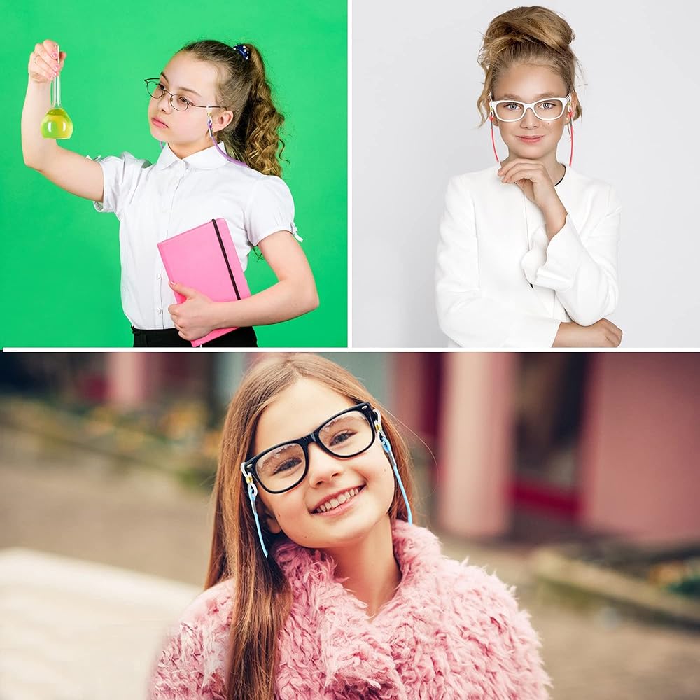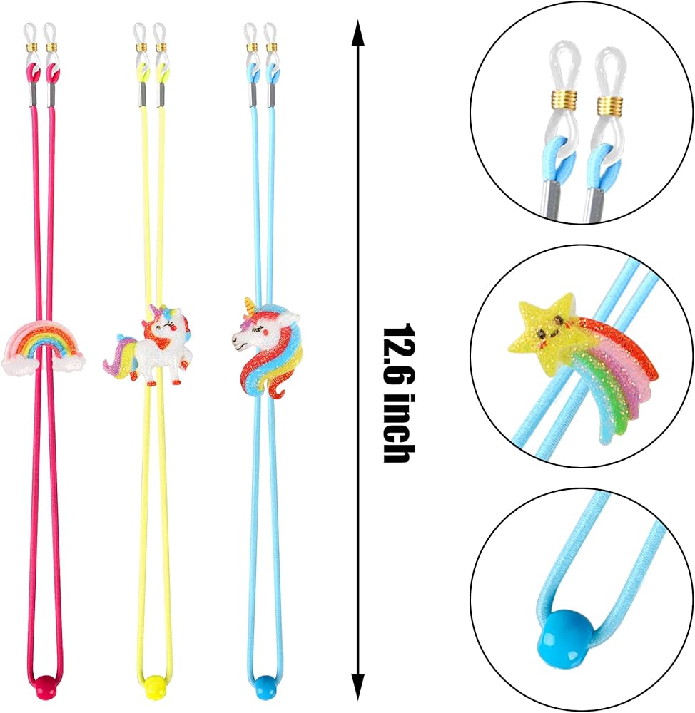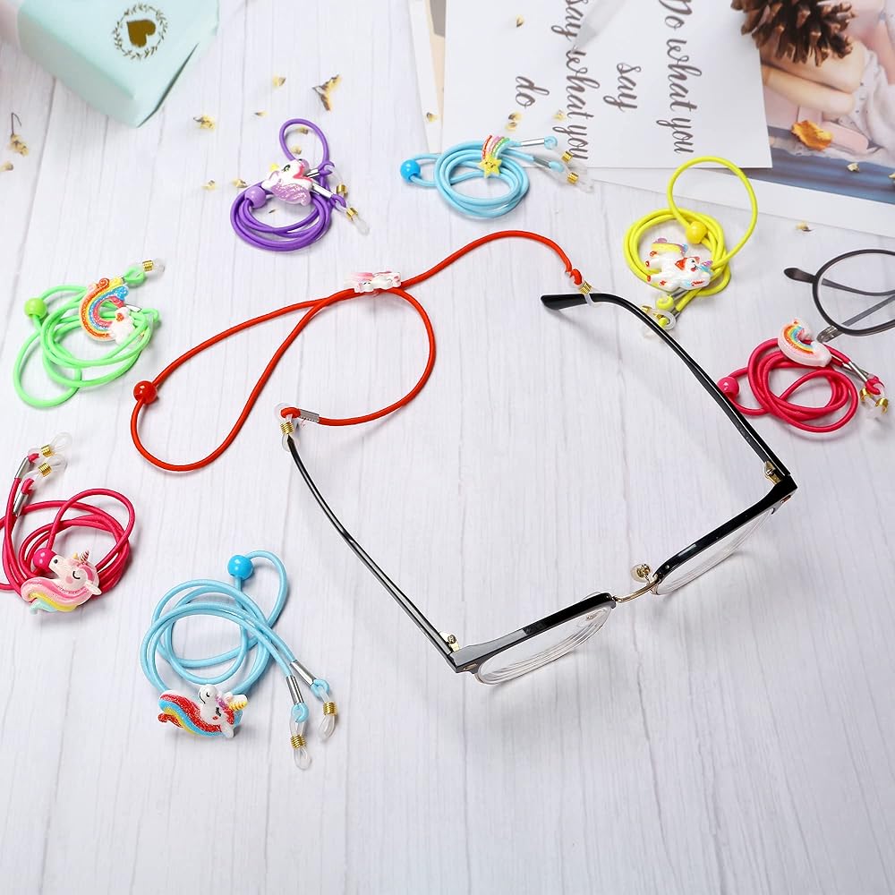التصميم: ديكورات لطيفة على شكل وحيد القرن بألوان قوس قزح مع طلاء لامع مصمم خصيصًا للفتيات. أحزمة النظارات هذه مناسبة لجميع أنواع النظارات. يمكنك بسهولة ضبط إحكامها لمنع النظارات من الانزلاق.