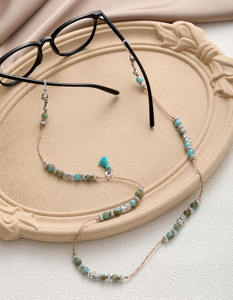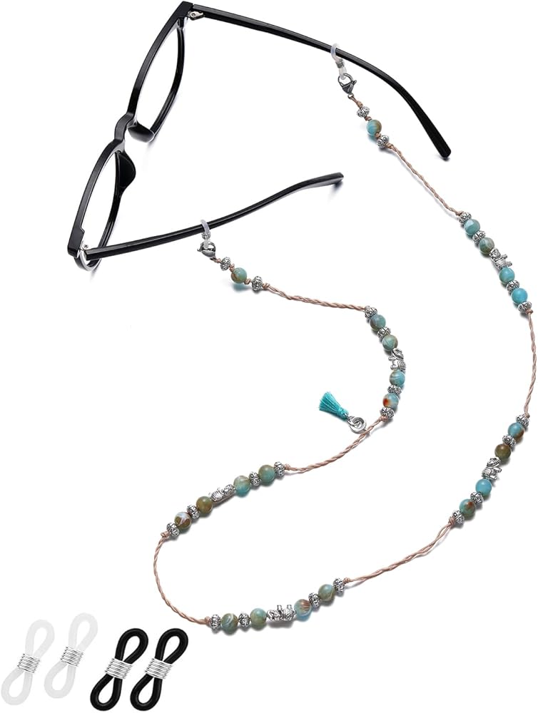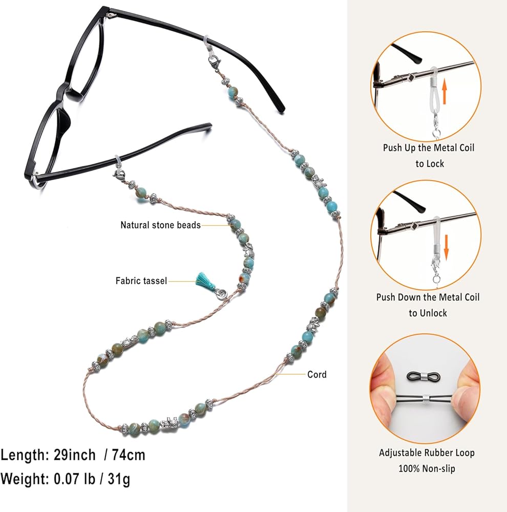 سلسلة نظارات متعددة الوظائف - يتراوح طول أشرطة النظارات بين 27 و29 بوصة (لا تشمل الحلقات المرنة). طرفي سلسلة النظارات عبارة عن مشابك على شكل سرطان البحر مع حلقة مطاطية، قم بإزالة الحلقات المطاطية، سلسلة النظارات هذه يمكنك استخدامها لعمل أي ديكورات تحتاجها. لا يمكن أن تكون سلاسل نظارات نسائية فحسب، بل يمكن أيضًا أن تكون قلادة طويلة بنمط بوهو.