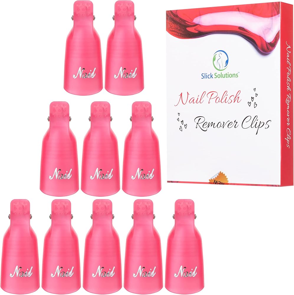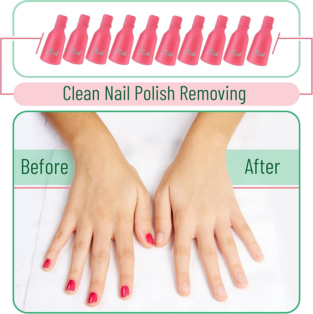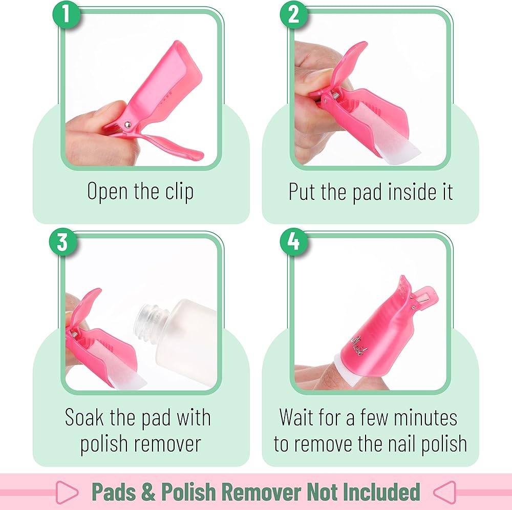يتم وضع المجموعة المكونة من 10 مشابك قابلة لإعادة الاستخدام فوق كل إصبع وأظافر لتثبيت الوسادة القطنية المنقوعة بالأسيتون بإحكام وراحة في مكانها، مما يضمن أن النقع سريع وفعال.