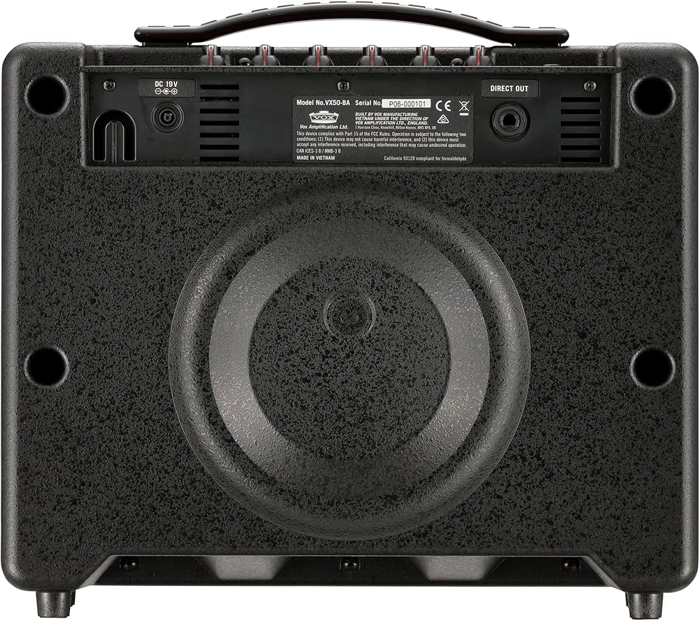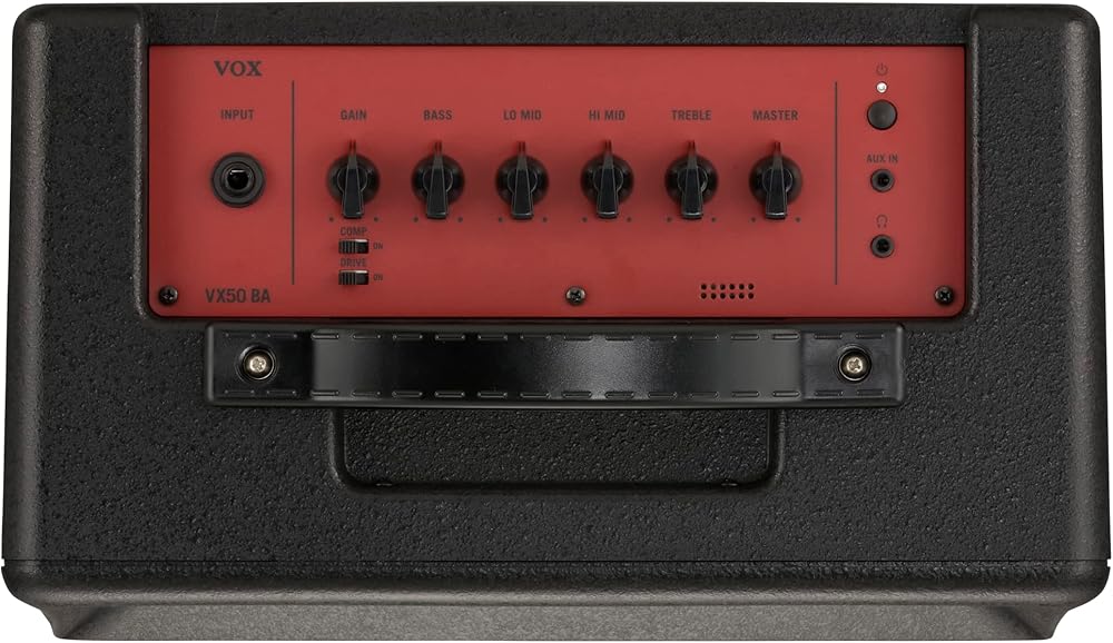 VX50 BA 50W 1x8 Bass Combo Amp. The VX50 BA offers 50W of smooth Vox bass tone for live or studio performances. The highly portable combo features a single with a 4-band EQ for thorough-yet-simple tone shaping, plus a built-in compressor to keep things tight and punchy. The cabinet construction is also optimized for low-end projection, so you're sure to sound great anytime. The VOX VX50 BA is a compact, lightweight and cutting-edge bass amplifier with an impressive 50 watts of output power and rich, deep bass tone courtesy of the Nutube-equipped pre-amp. Beyond its impressive sound, the VX50 BA provides players with a 4-band EQ, as well as on-board compression and overdrive for dialing in tight, punchy tones. There's also a full assortment of input/output jacks for connecting your headphones, media player or PA system. Weighing in at only 9.9 lb., the VX50 BA is a fully-featured bass amp that's perfect for the bassist on the go. The compact and lightweight VX50 BA features a VOX original 8 in. speaker, a unique bass reflex structure that ensures ample power and rich low-frequency reproduction, and warm vacuum tube sound courtesy of Nutube. There's also a 4-band EQ that allows detailed sound-shaping, a compressor effect that's indispensable for bass, and an overdrive effect that provides everything from subtle grit to high-gain overdrive. Also provided are a full complement of input/output jacks, including an aux. in jack, headphone jack and a direct out jack for direct connection to your PA system. Aesthetically, the VX50 BA sports a red color scheme, a traditional VOX vertical logo, and a metal grille for a distinct and edgy look that's sure to stand out on stage.