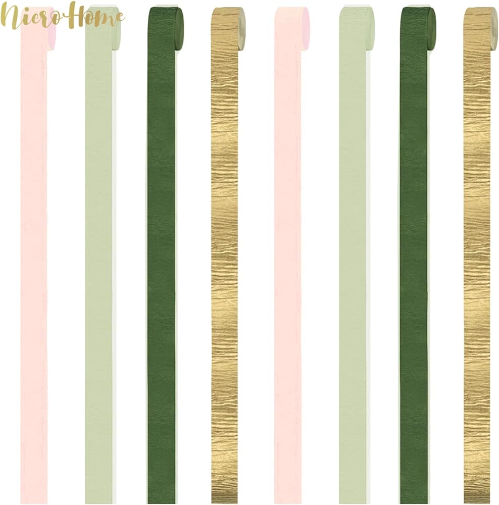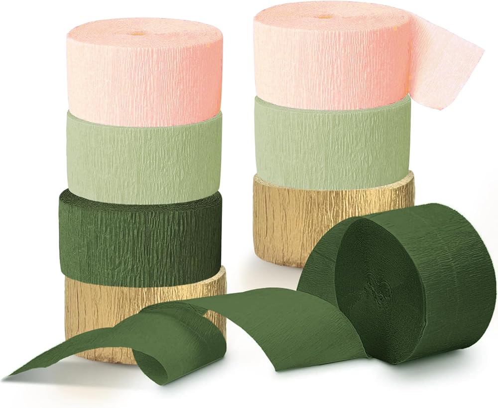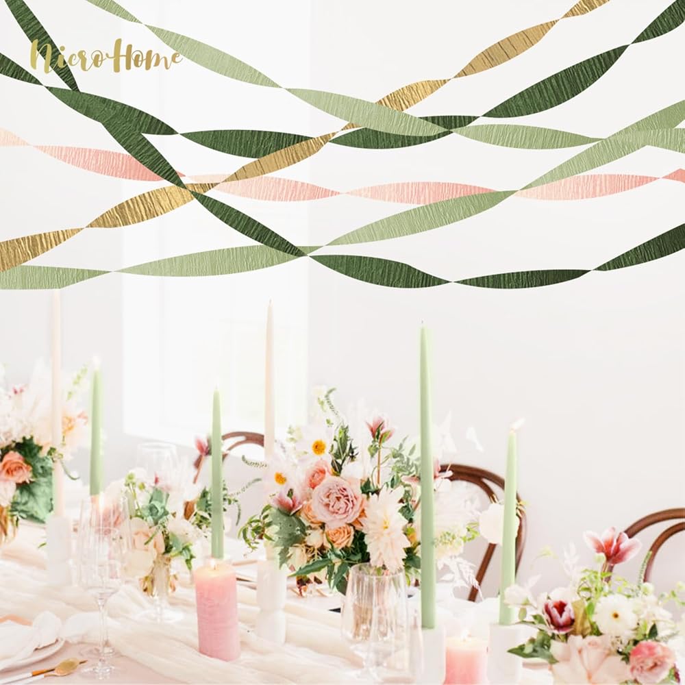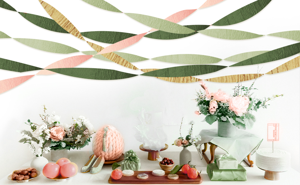 ديكور حفلات الخطوبة: تتكون مجموعة لفات ورق الكريب باللون الأخضر المريمية من لفات ورق الكريب باللون الذهبي والوردي والأخضر المريمية، وأربعة ألوان مختلفة متشابكة لخلق حفلة رومانسية مثالية.