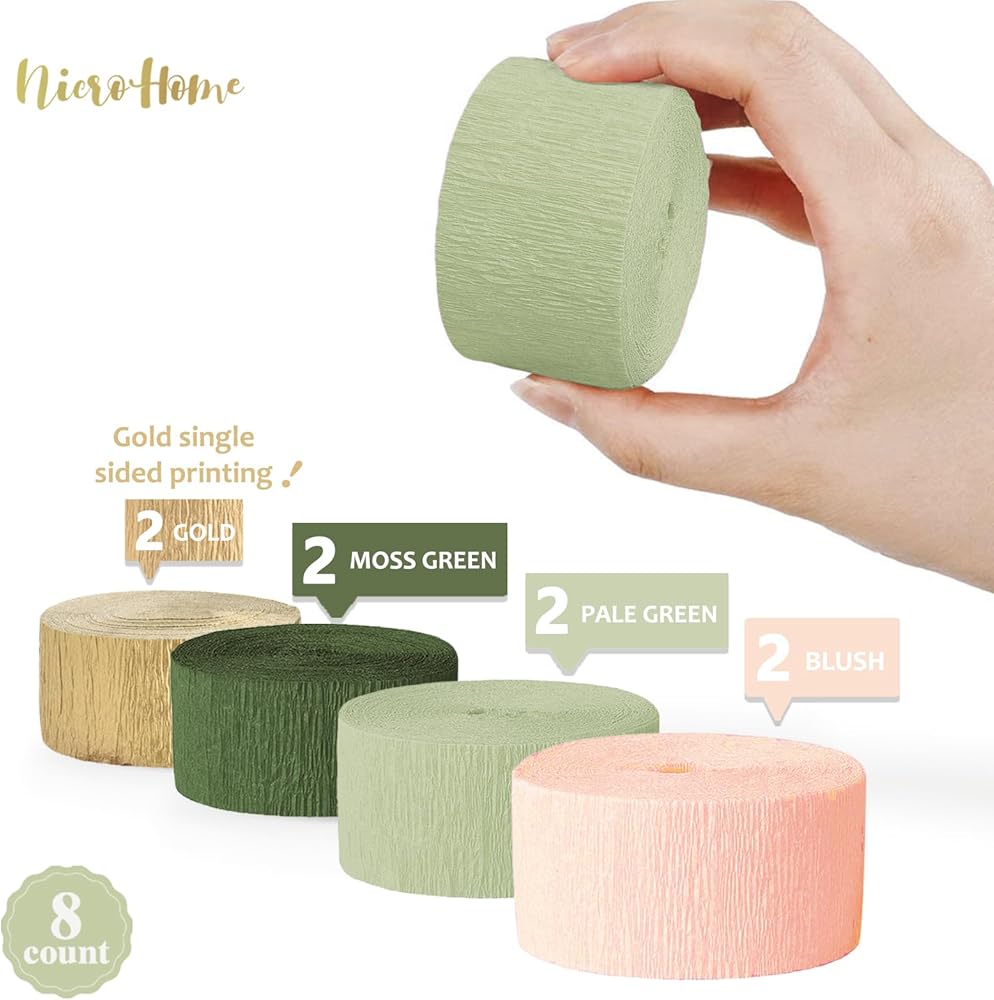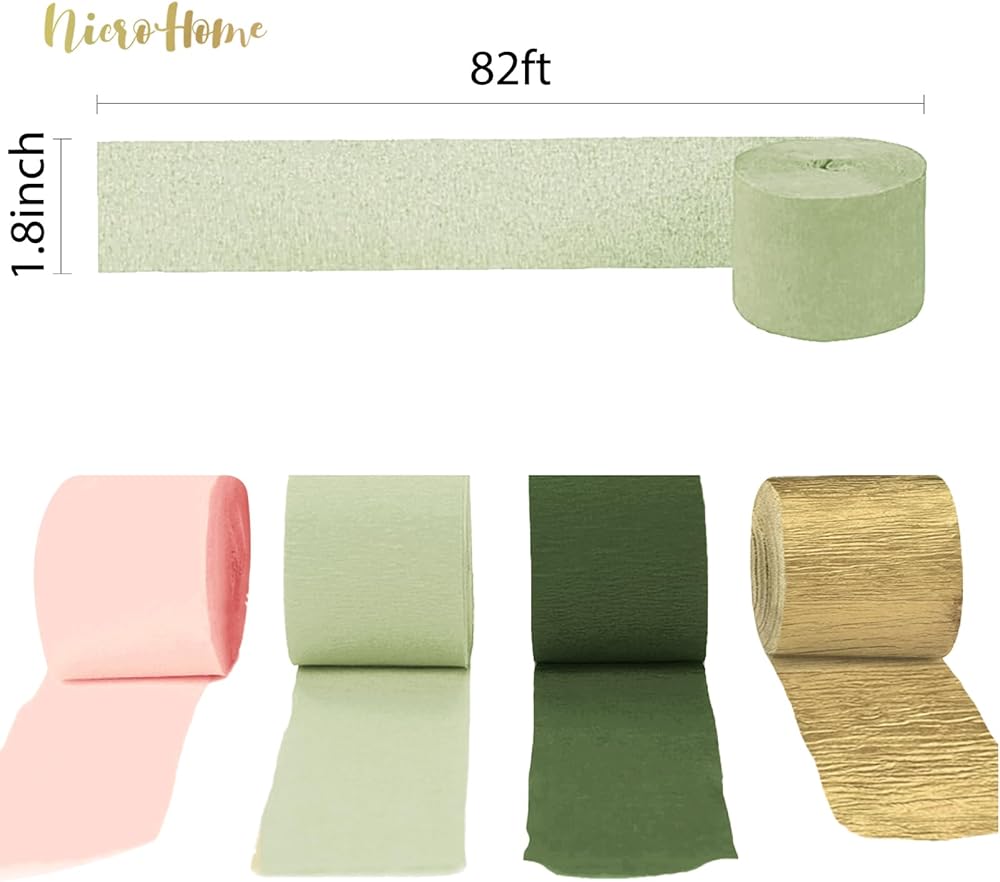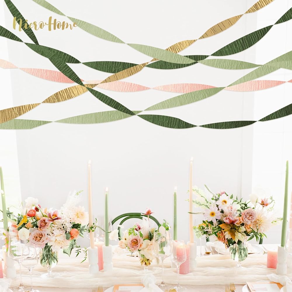 ديكور حفلات الخطوبة: تتكون مجموعة لفات ورق الكريب باللون الأخضر المريمية من لفات ورق الكريب باللون الذهبي والوردي والأخضر المريمية، وأربعة ألوان مختلفة متشابكة لخلق حفلة رومانسية مثالية.