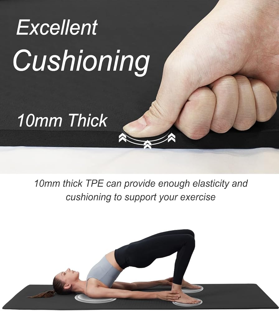 • سُمك فائق راحة فائقة: سُمك حصري 10 مم يجعل تمرينات الأرضية أكثر راحة، ويمنع إصابات العمود الفقري والفخذين والركبتين والمرفقين على الأرضيات الصلبة. وفي الوقت نفسه يساعد على امتصاص الاهتزاز ويقلل الضوضاء