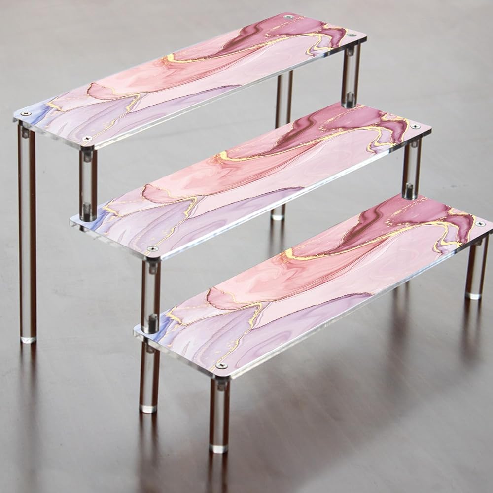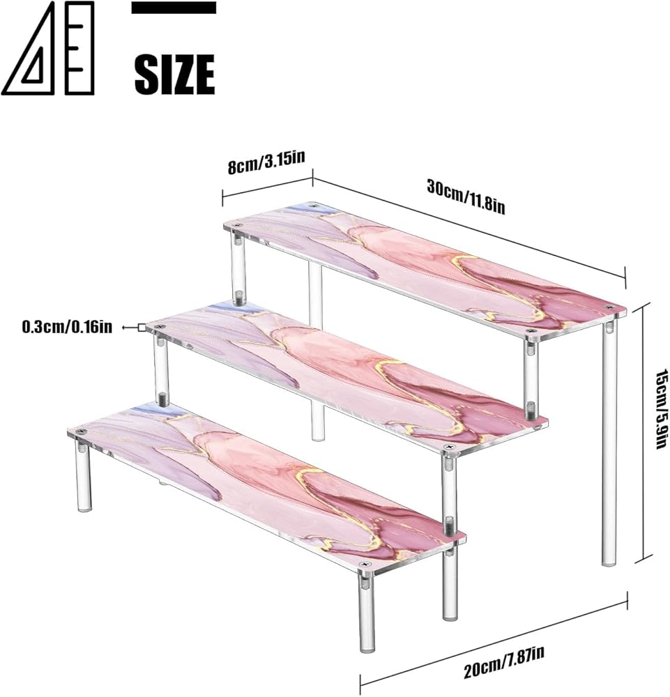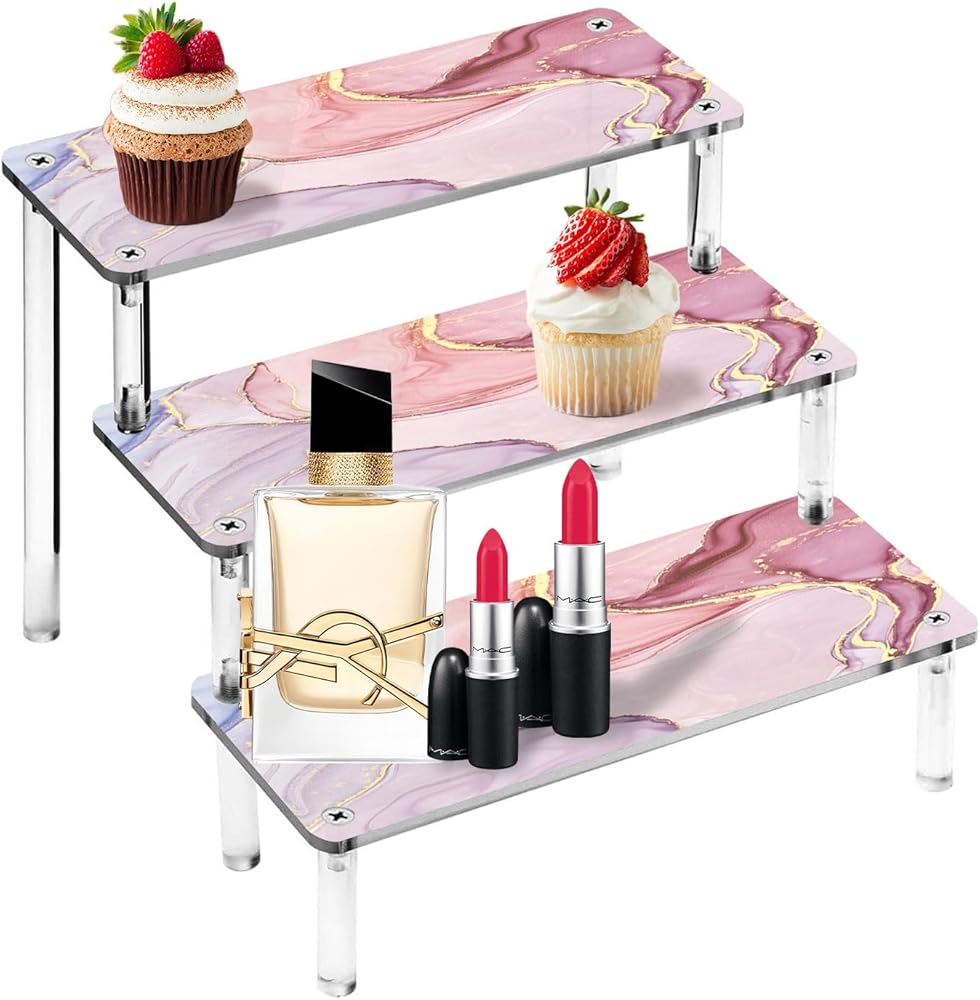 [DURABLE AND STABLE]: Made with sturdy acrylic material, our product organizer can hold up to 3 tiers of shelves without wobbling or tipping. Ideal for creating a tiered tray or cupcake stand.
