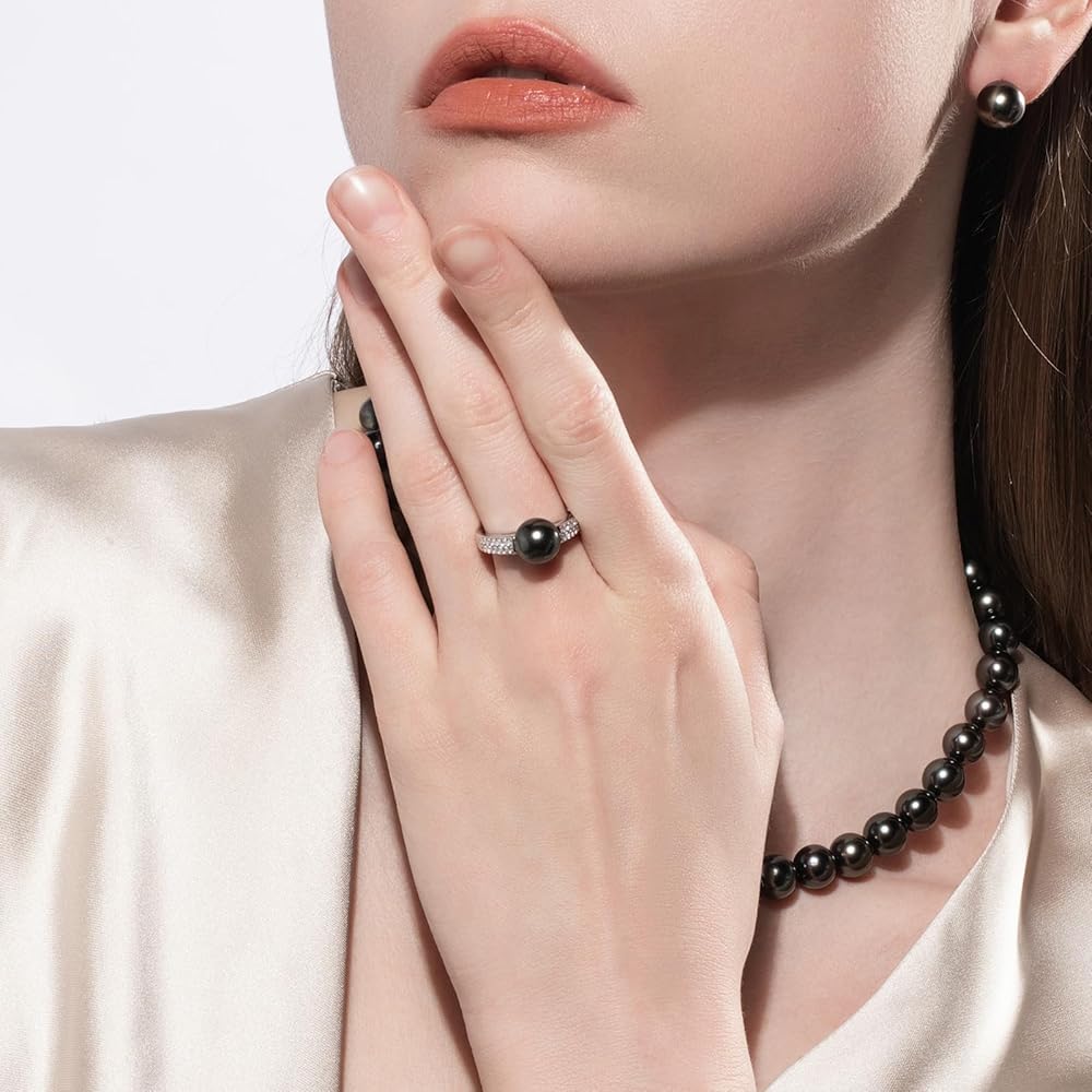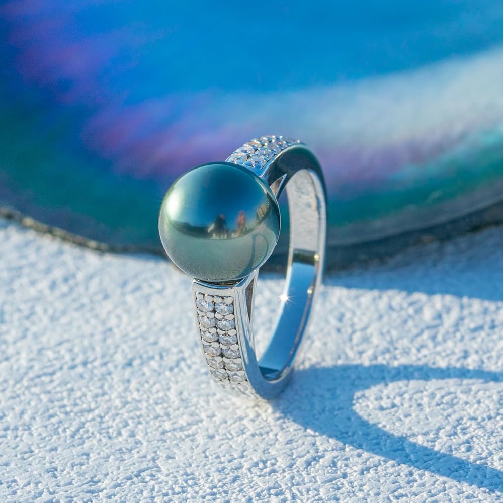 يتميز هذا الخاتم الأنيق بلؤلؤة تاهيتية واحدة لا تشوبها شائبة مقاس 9-10 مم محاطة بصفين متوازيين مكونين من 24 ماسة مويسانيتي مرصوفة. يتم وضع اللؤلؤة السوداء يدويًا على شريط الفضة الإسترلينية. ويكمل بريق المويسانتي الأبيض الناعم اللون الغريب الداكن الطبيعي لللؤلؤ.