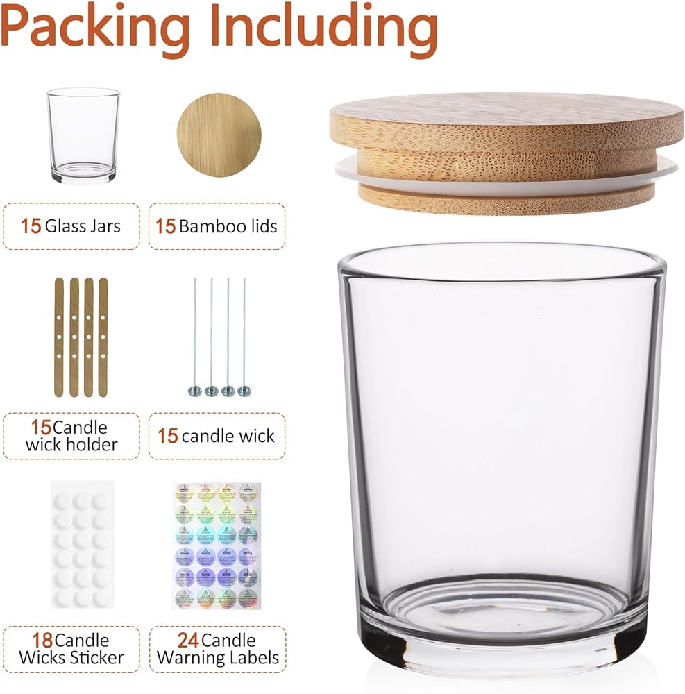 محتوى العبوة: 15 قطعة من برطمانات الشموع الزجاجية بوزن 7oz (شفاف)، 15 حامل فتيل شموع خشبي، 15 فتيل شمعة، 24 ملصق تحذير للشموع، 18 نقطة صمغ لفتيل الشموع. إذا كنت مبتدئًا في صناعة الشموع، فإن مجموعة برطمانات الشموع هذه ستأتي بالتأكيد في متناول يدك، وإذا كنت صانع شموع ذو خبرة، فإن هذه الملحقات ستمنحك أيضًا بعض المساعدة.