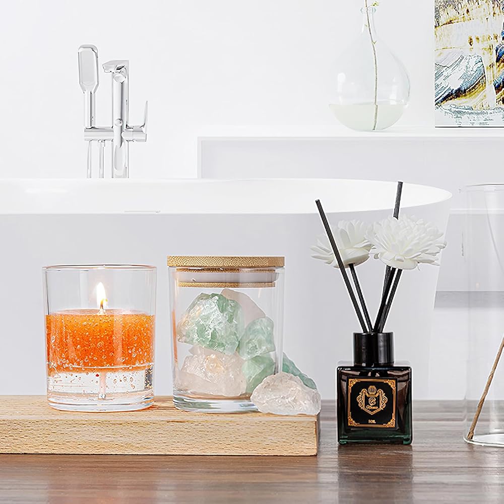 المواد: أوعية الشموع مصنوعة من زجاج سميك، مقاومة للحرارة، مقاومة للانفجار، خالية من الرصاص، غير سامة، قابلة لإعادة الاستخدام وأكثر أمانًا من البرطمانات البلاستيكية. الغطاء مصنوع من الخيزران الطبيعي والخالي من التلوث، مع قفل لمنع الشمعة من ملامسة الهواء والحفاظ على العطر.