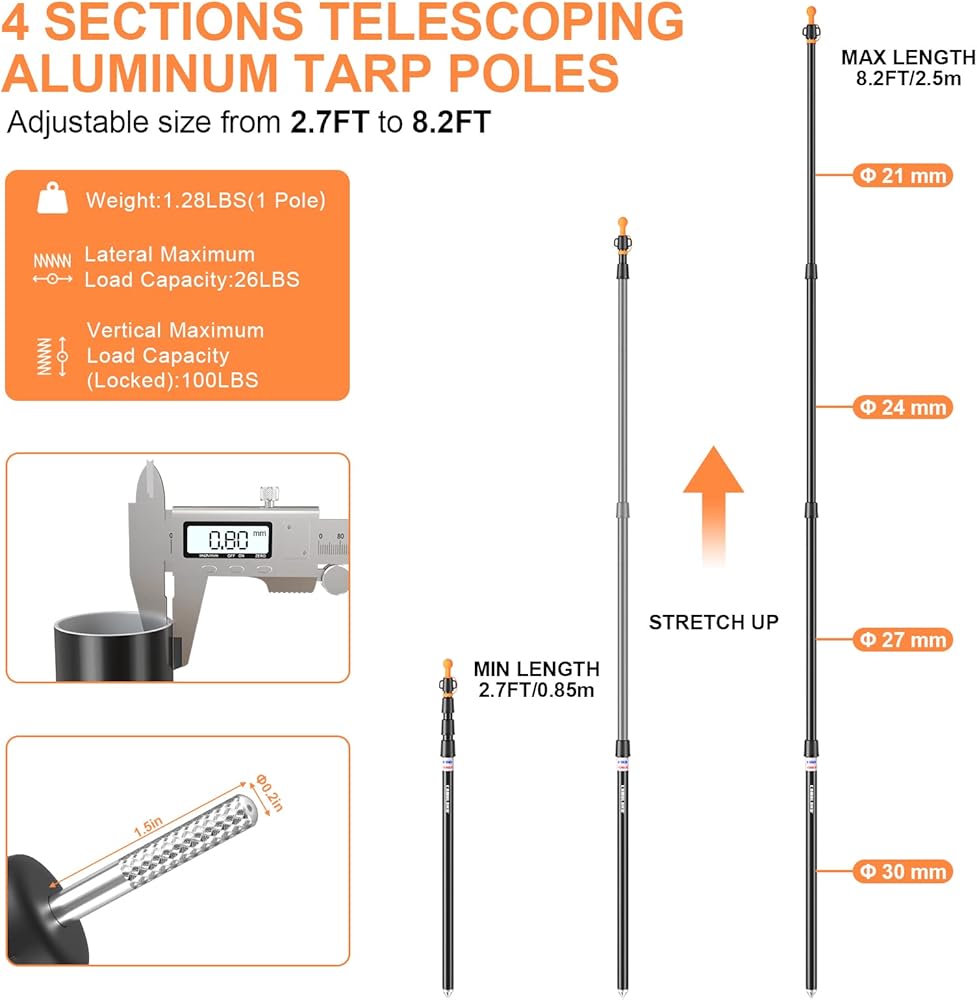 صغير الحجم ومريح للاستخدام: يزن كل عمود تلسكوبي 1.28 كجم فقط، ويتميز بتصميم من 4 أقسام. مع آلية قفل ملتوية بسيطة، يمكن تعديل الارتفاع بحرية ضمن نطاق من 2.7 قدم إلى 8.2 قدم. تأتي مع حقيبة تخزين من قماش أكسفورد لسهولة الحمل.