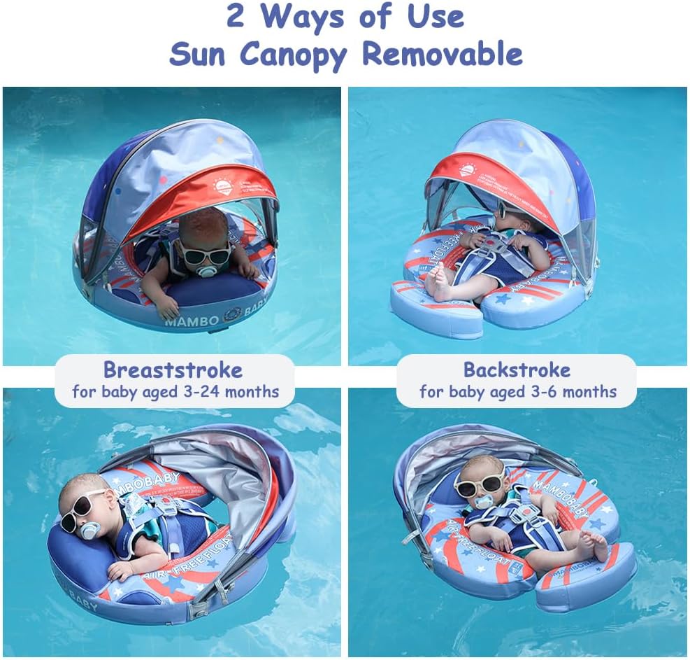 【طريقتان للاستخدام، مظلة شمسية ذات حماية كاملة】تناسب عوامة الطفل أوزان الأطفال من 13 رطلاً إلى 40 رطلاً. مع محيط الصدر 1.7 بوصة كحد أقصى. تحتوي على أوضاع سباحة الصدر وضربة الظهر التي يمكن لطفلك أن يتخذها. سباحة الصدر للأطفال من عمر 3 إلى 24 شهرًا، وضربة الظهر للأطفال من عمر 3 إلى 6 أشهر. مظلة الشمس ثلاثية الأبعاد القابلة للتعديل للطفو بعامل حماية من أشعة الشمس 50+، تحمي طفلك بالكامل من الشمس بزاوية 360 درجة. المظلة قابلة للإزالة، ويمكنك خلعها أو طيها للاستمتاع بمزيد من الاتصال مع طفلك في الماء.