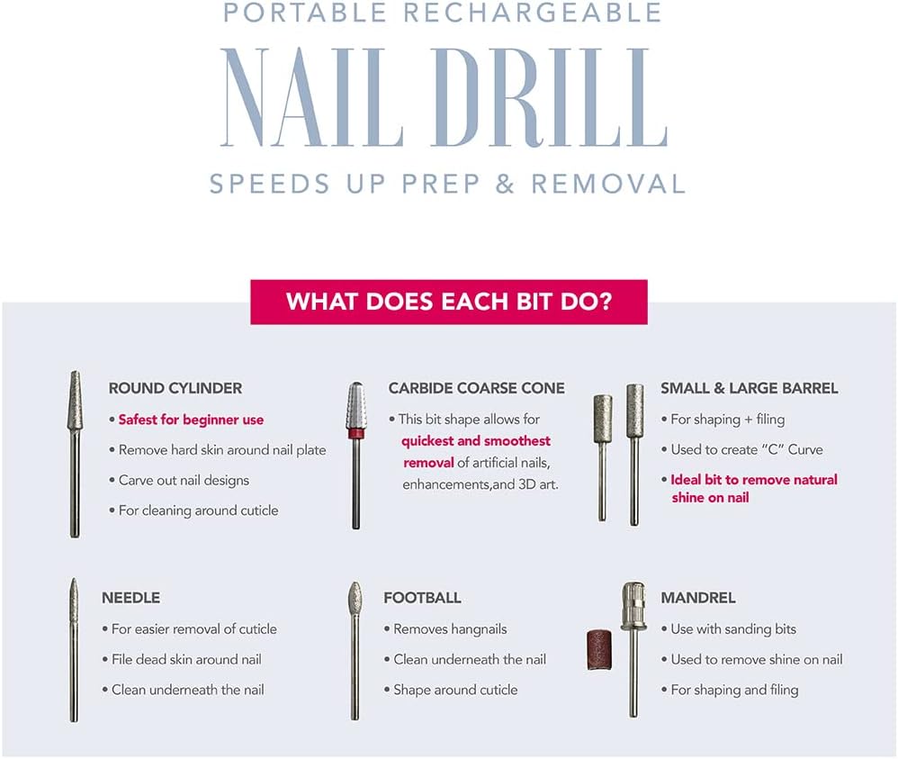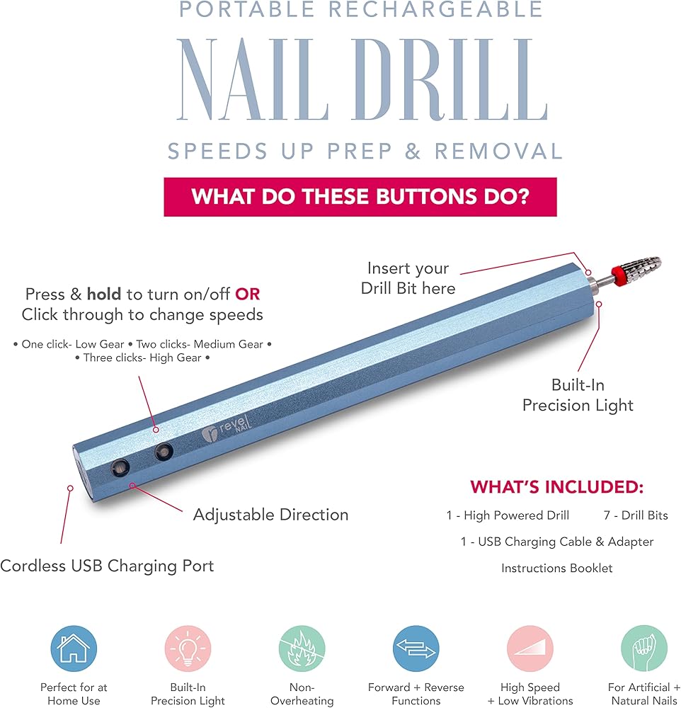 نقدم لك مبرد الأظافر المحمول من ريفيل نايل! مثالي للمستخدم في المنزل، المثقاب الخاص به قابل للحمل، بدون أسلاك، خفيف الوزن وسهل الاستخدام. امنحي أظافرك علاج صالون التجميل براحة في منزلك!