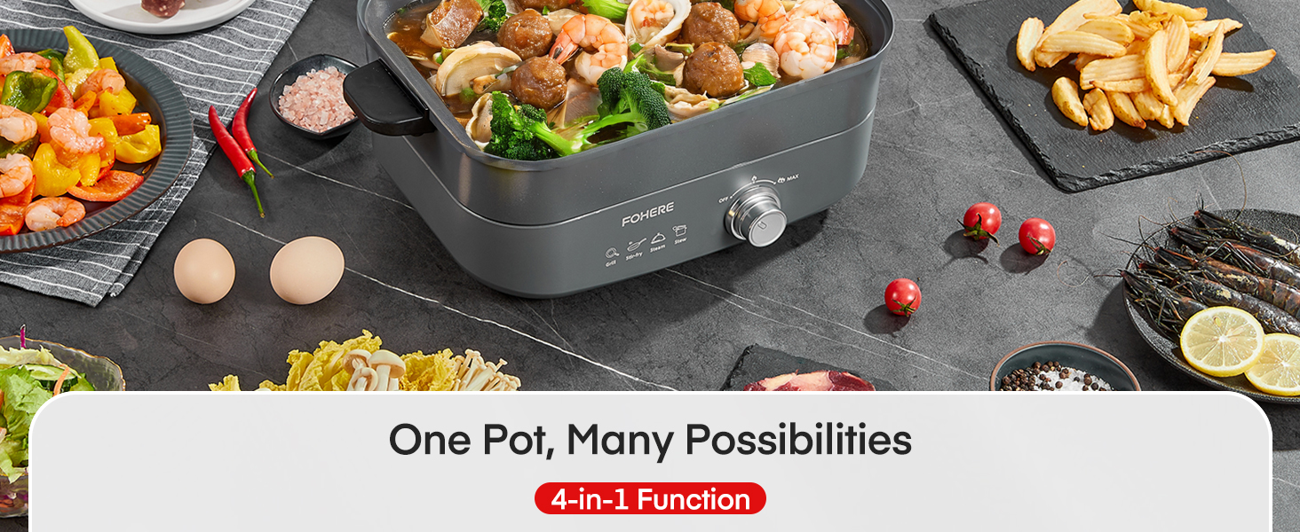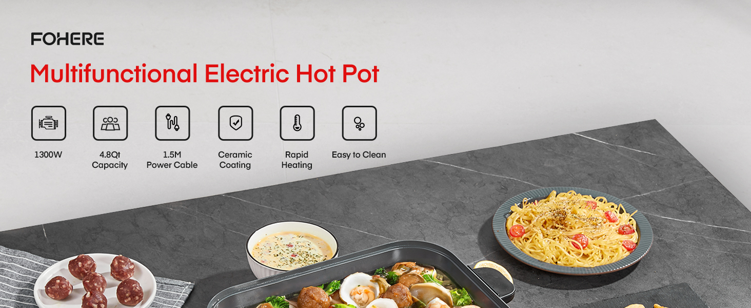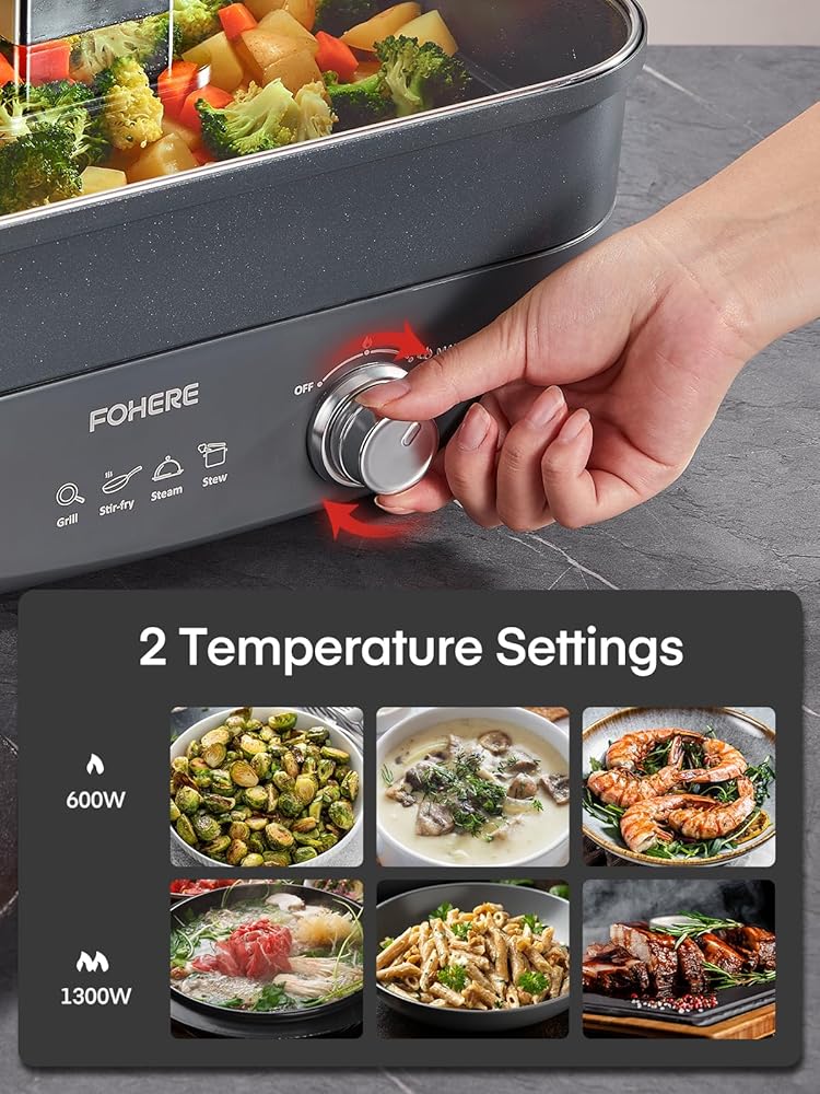 👪【سعة 4.8QT لتجمع الأشخاص】بسعة 4.8 كوارت، وعاء FOHERE الساخن الكهربائي مناسب لـ 3-5 أشخاص. يلبي تنوع الطبخ. إلى جانب استخدامه كوعاء شابو شابو، يمكن استخدامه أيضًا للشواء والقلي العميق والقلي السريع والحساء والبخار. استمتع بمتعة مشاركة العشاء مع عائلتك أو أصدقائك!