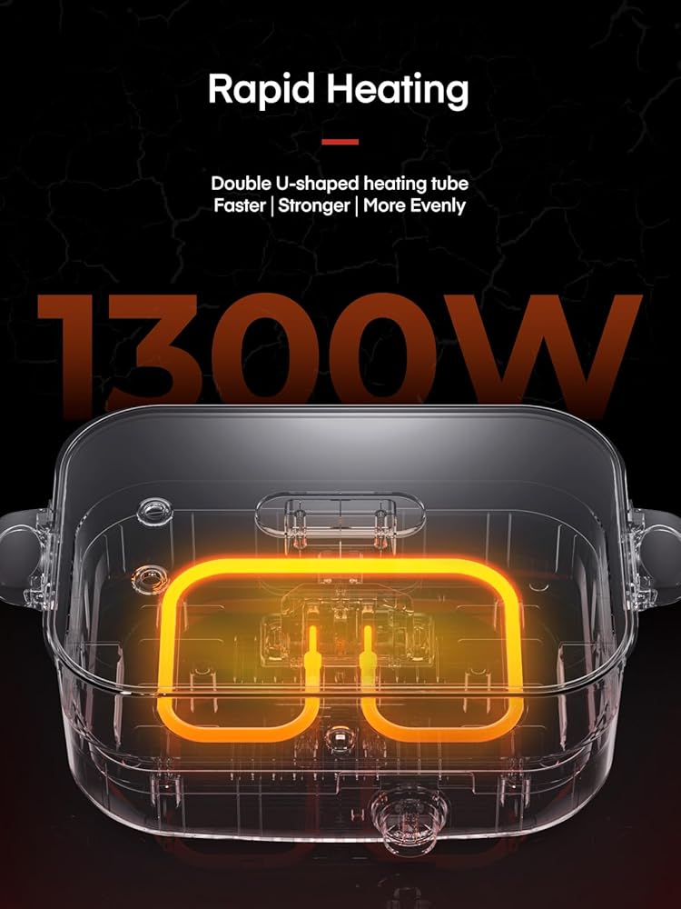 🍲(تسخين سريع والحفاظ على دفء الطعام) قوة الذروة 1300 واط وأنبوب التسخين المزدوج على شكل حرف U يجعل الوعاء الكهربائي يغلي في وقت قصير، ويسخن بسرعة وبشكل متساوٍ. عند الوصول إلى الطاقة التي تحددها، سيحافظ الوعاء الساخن على درجة الحرارة هذه للحفاظ على دفء الطعام.