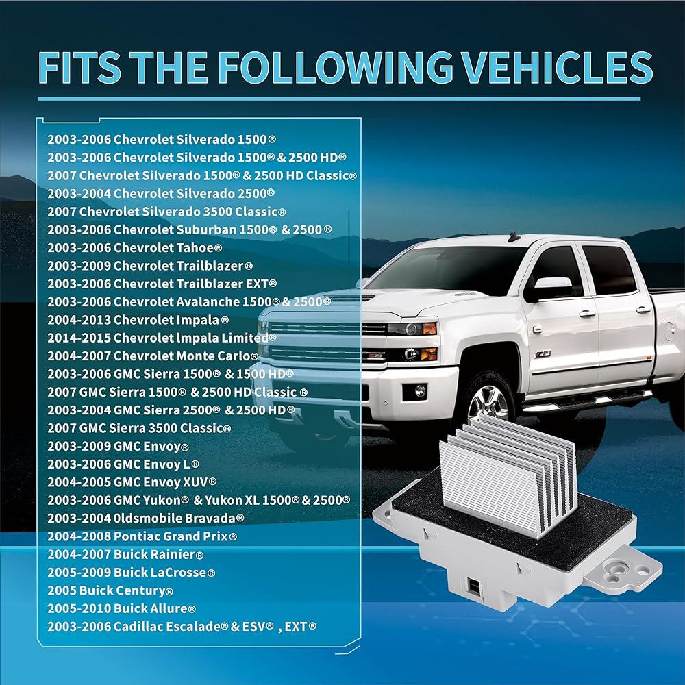 التركيب الدقيق: تم تصميم مجموعة مقاومة محرك المنفاخ هذه خصيصًا لمركبات جي إم سي وكاديلاك وبويك وغيرها من مركبات جنرال موتورز - 2003 - 2006 سيلفرادو 1500، 2500، تاهو، سوبربان | انهيار جليدي 2003-2006 | 2003-2006 سييرا 1500، 2500، يوكون، يوكون XL | 2003 - 2009 تريل بليزر وجي إم سي إنفوي | 2004 - 2007 رينييه | 2003-2006 إسكاليد، تحويلة، ESV