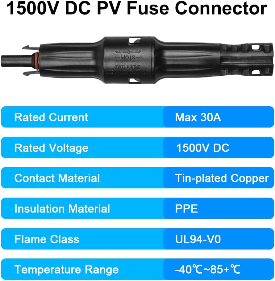 【Safe and Stable】: The solar fuse holder connector is used to protect your photovoltaic system.when the rated current of the fuse is exceeded,it will quickly and automatically interrupt the circuit,effectively protecting your photovoltaic appliances.