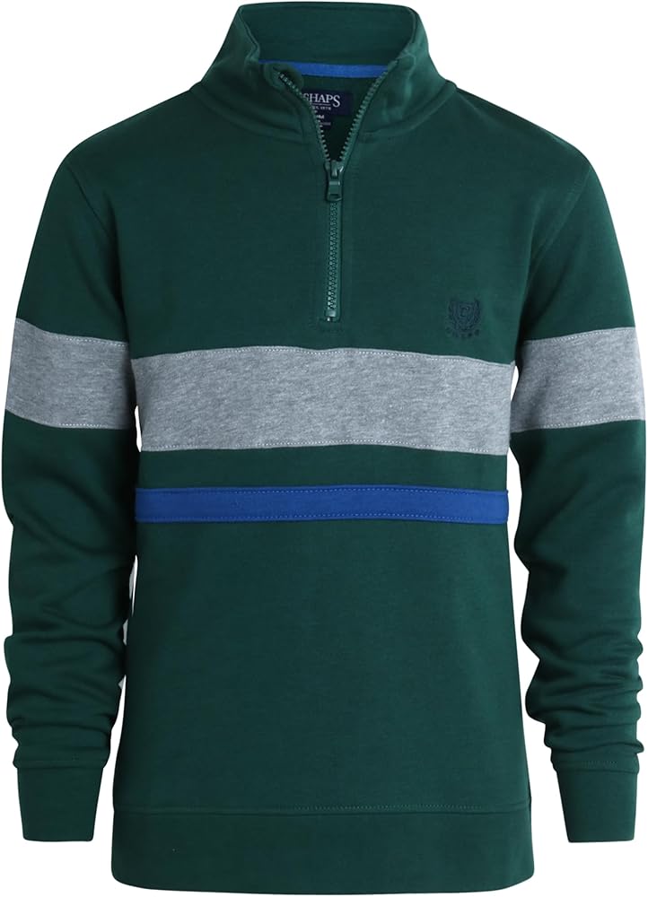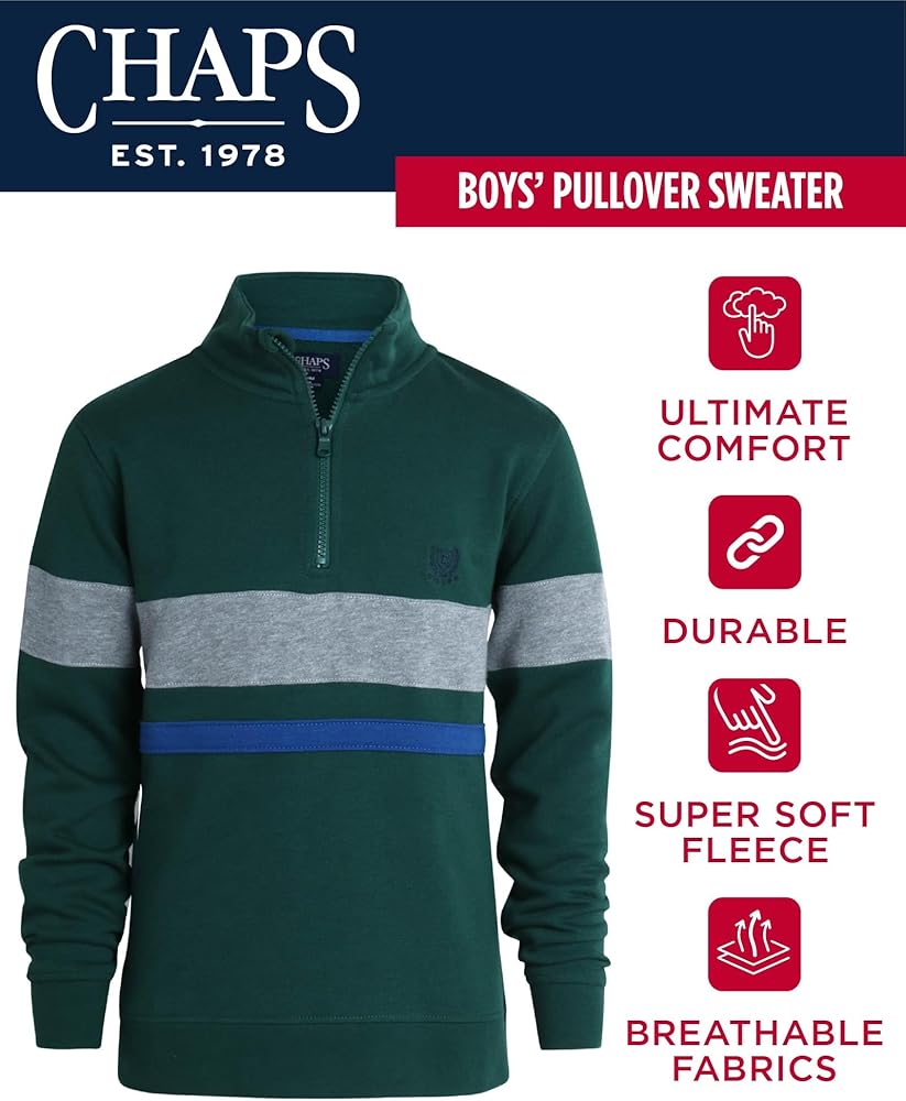 HIGH-QUALITY MATERIALS: Chaps is known for its commitment to quality, and this sweater is no exception; It's constructed from top-quality materials, ensuring it's soft against the skin and comfortable to wear all day long; The durability of this sweater makes it ideal for active young boys, withstanding their day-to-day adventures; With Chaps, you can trust in a brand that combines quality and style in each of its products, including this Quarter Zip Pullover Sweater for boys