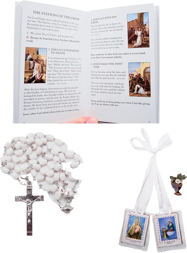 Five Piece Communion Set. This deluxe Box Set kit includes all the items needed to prepare a girl for her First Holy Communion Day and Heavenly Feast. This makes a great Keepsake from her special day.