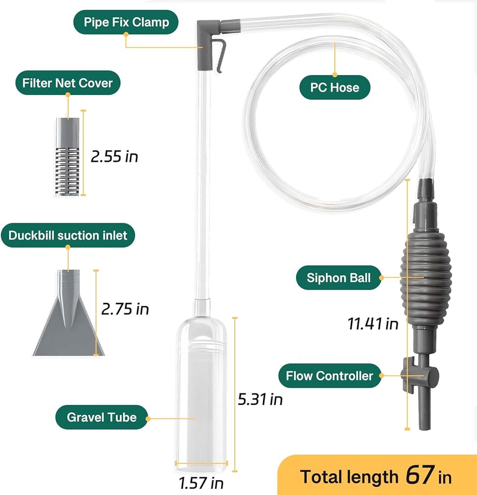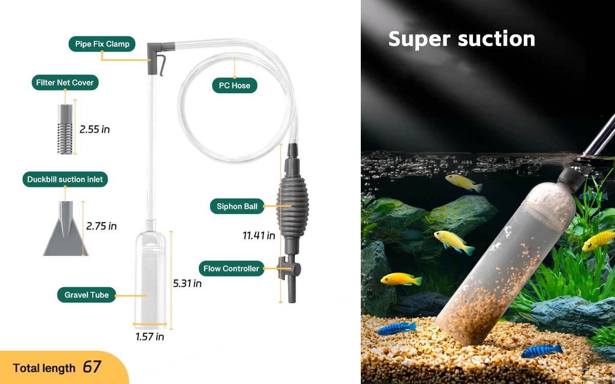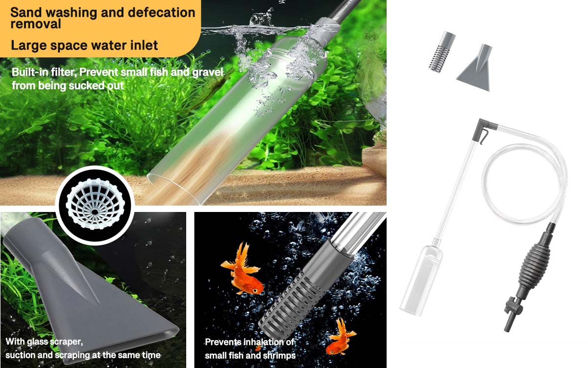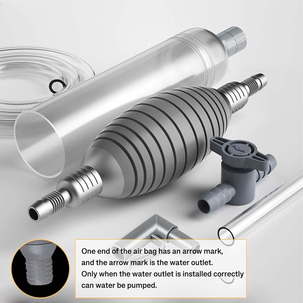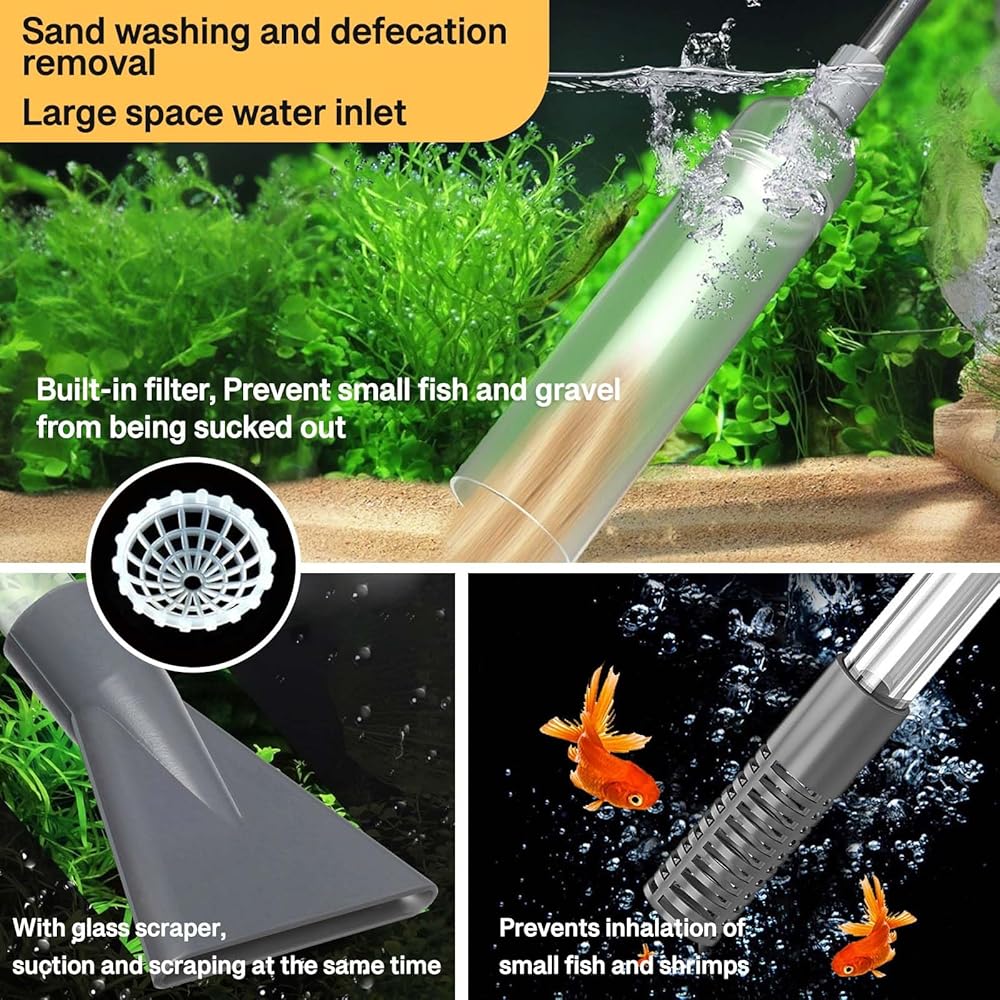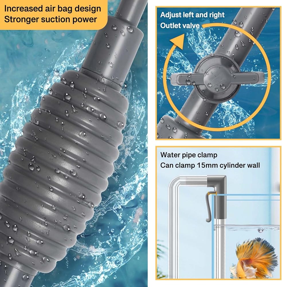 • 🐟️منظف خزان الأسماك: سهل التحكم، ومريح لشفط براز الأسماك والشوائب والمياه العكرة من خزان الأسماك. لا يمكنه فقط تغيير الماء بسرعة، وسحب براز الأسماك، ولكن أيضًا تنظيف الحصى والرمل بشكل فعال.