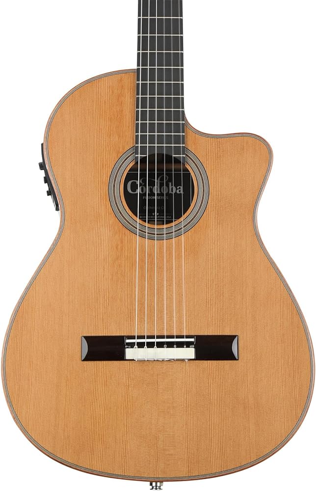 The Orchestra CE is one of our best selling crossover guitars. Available with a solid Canadian cedar top and rosewood back and sides, this model's main feature is its slim neck profile and only 12 frets to the body, which maximizes the amount of resonance and vibration across the soundboard. It's the perfect blend of classic Spanish designs with modern aesthetics—a hand-inlaid wooden rosette, elegant mahogany binding and a high gloss PU finish. Ready to plug in and play, the Orchestra CE comes equipped with the Fishman Presys Blend preamp.