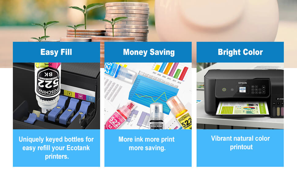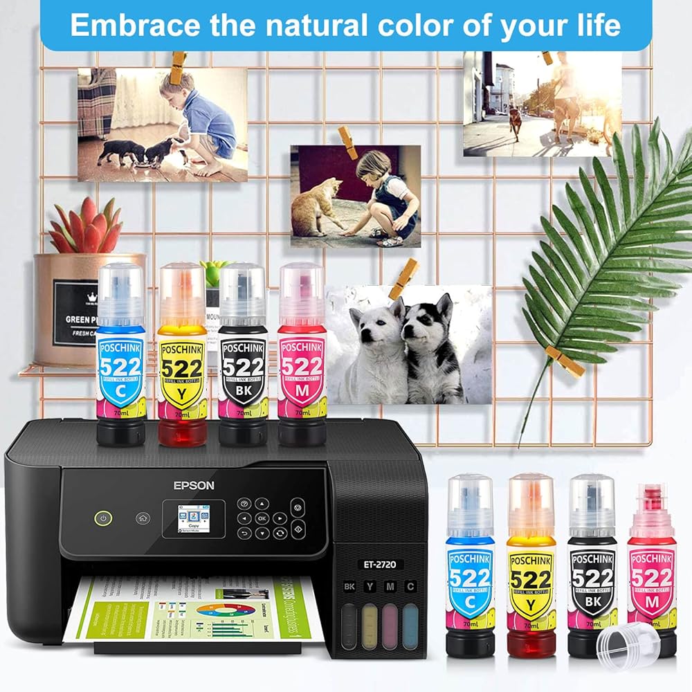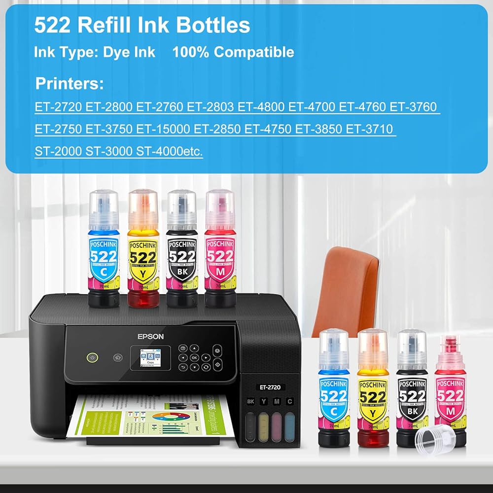 • الطابعات المناسبة: زجاجات الحبر T522 مناسبة لطابعات Ecotank مثل ET-2720 ET-2800 ET-2803 ET-4700 ET-4800 إلخ.