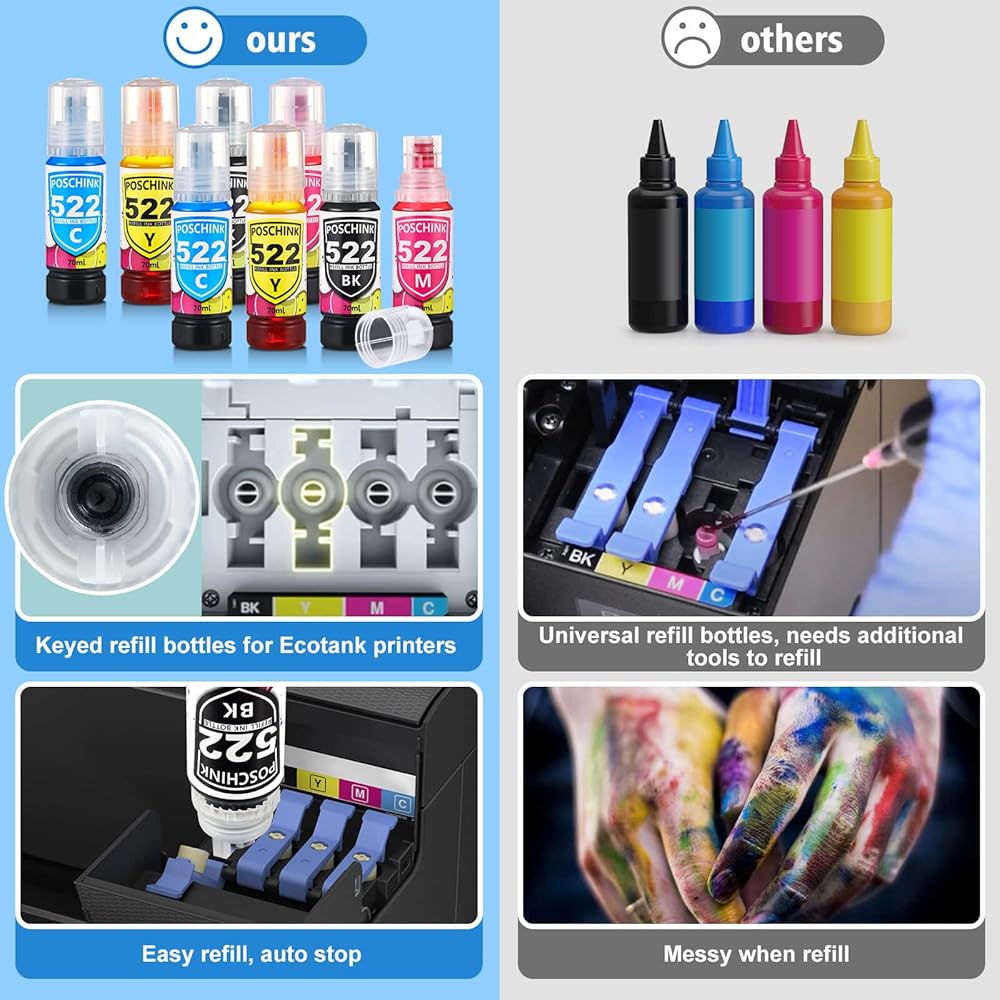 • سهولة التعبئة: تم تصميم زجاجة الحبر 522 بشكل فريد لسهولة ملء طابعات Ecotank ET2720 ET2800 ET2803 ET4700 ET4800. التوصيل وإعادة التعبئة، التوقف التلقائي.