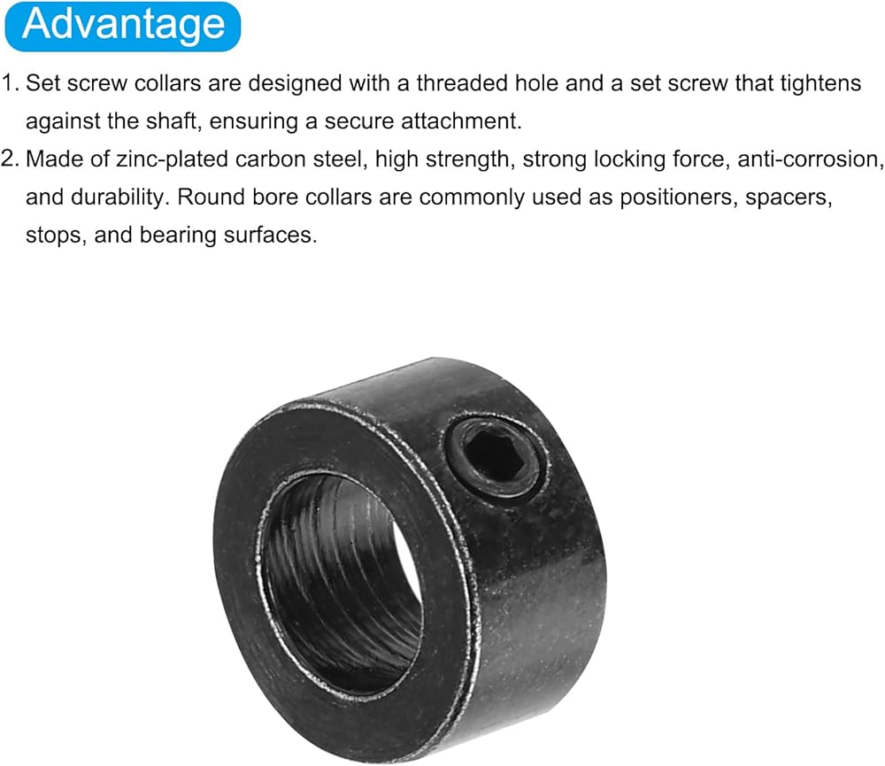 Set screw shaft collar made of carbon steel, stable performance, oxidation resistance and rust resistance, long service life. The design has good matching performance, closely fits the guide shaft, and has strong locking force and support force.