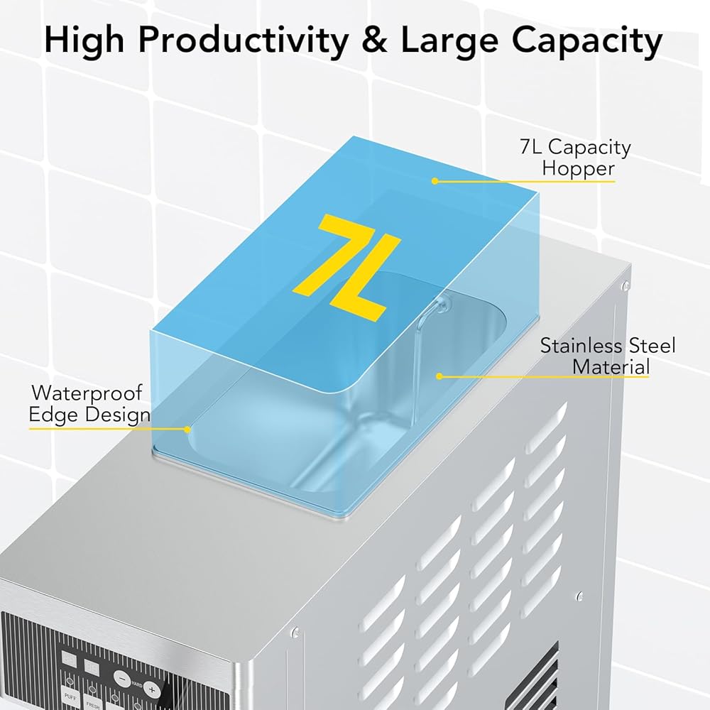 سعة كبيرة 7 لتر: تحتوي آلة الآيس كريم التجارية هذه على قمع تخزين بسعة 7 لتر مصنوع من الفولاذ المقاوم للصدأ الآمن غذائيًا، مما يسمح بأقصى استخدام للمواد الخام والإنتاج الفعال.
