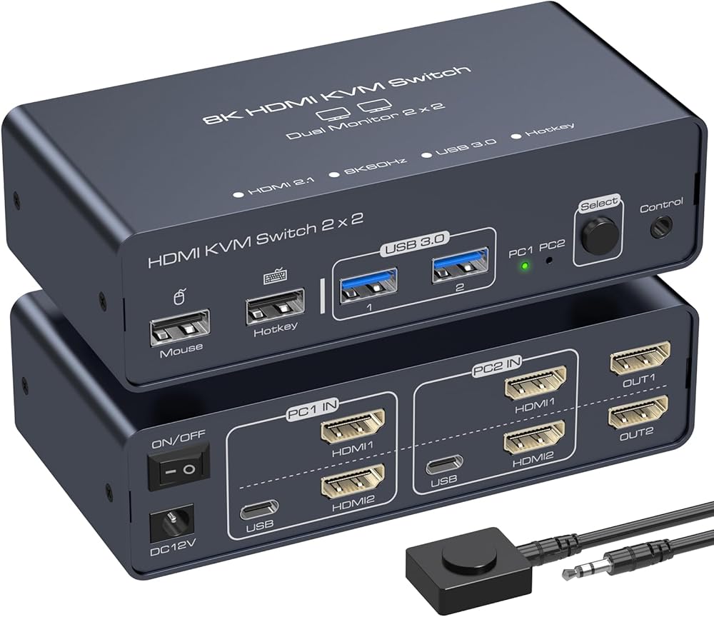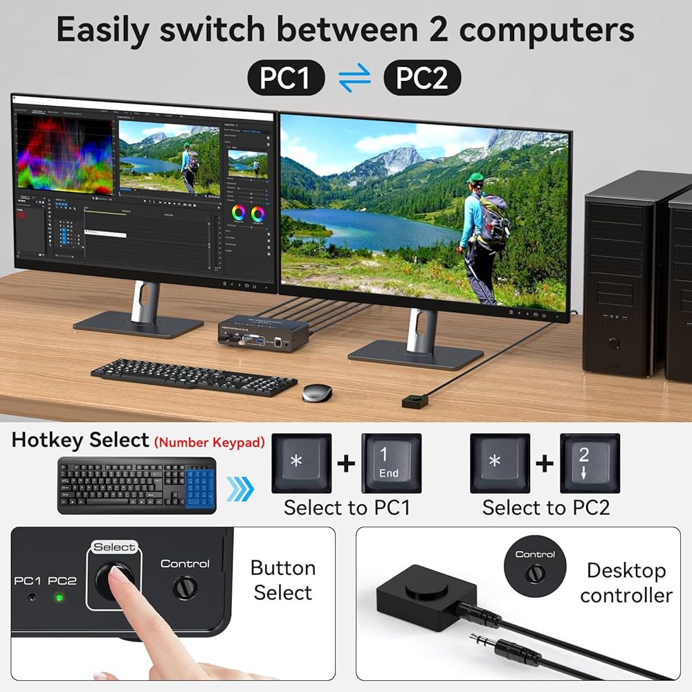 【Two Switching Options】The 8k hdmi kvm switch provides two switching options: 1. Simply press the selection button on the device to switch the signal source. The signal indicator next to the selection button will display the active signal source. 2. You can use the wired remote button to place the KVM switch outside of your work area and switch with a single button press. Note: Switching via hotkeys is not supported.